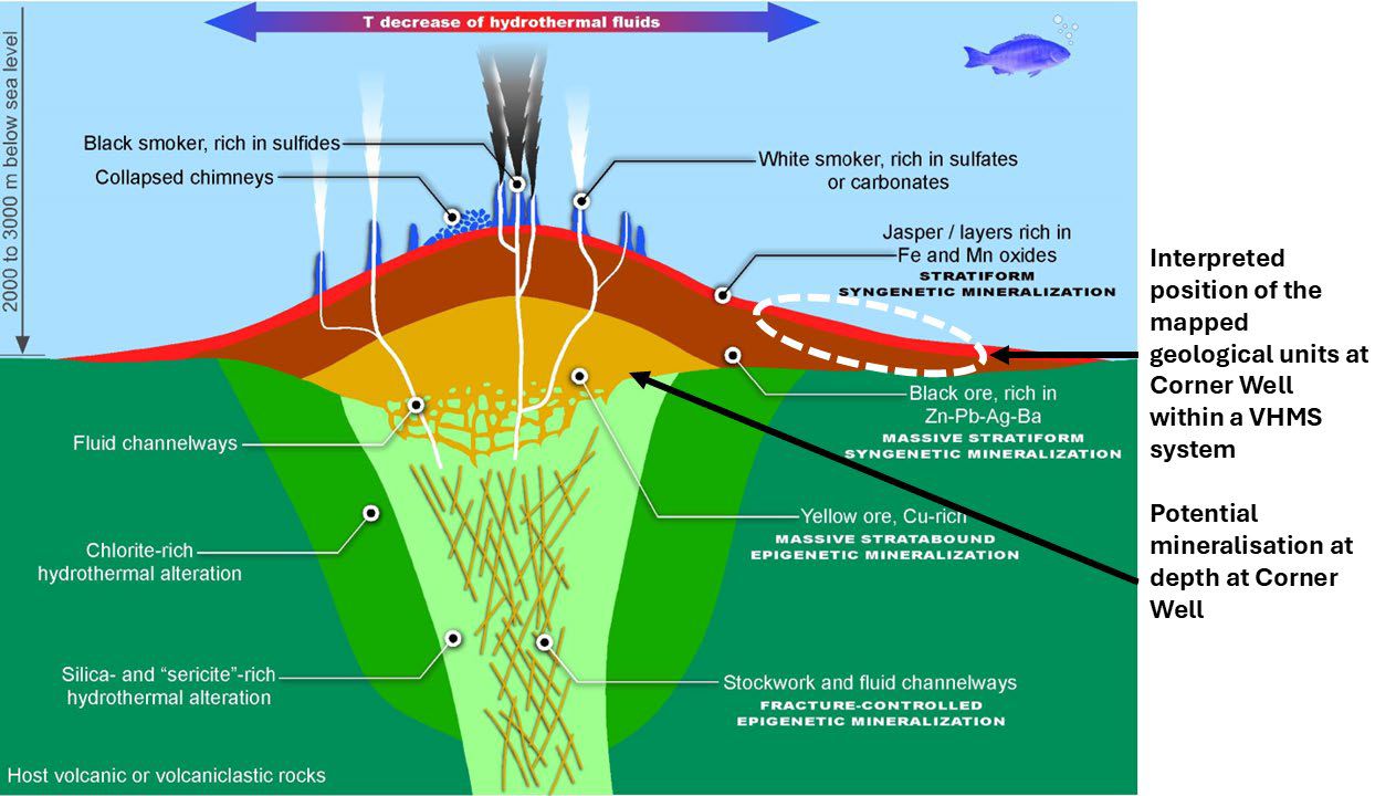 The Company interprets that the zoned lag soil lead-zinc and copper anomalism together with the mapped geological association between sedimentary and volcanic rocks suggests a deep seafloor geological environment, represents a highly prospective VHMS mineralisation system at Juggernaut. The Company believes the mapped geological units at surface represent a position outboard from a volcanic vent, with potential at depth to define copper mineralisation below a black smoker position of a VHMS system, as shown in Figure 6*. The association between the mapped fault and interpreted fault structures and lag soil copper anomalism is considered potential leakage of mineralisation at depth.