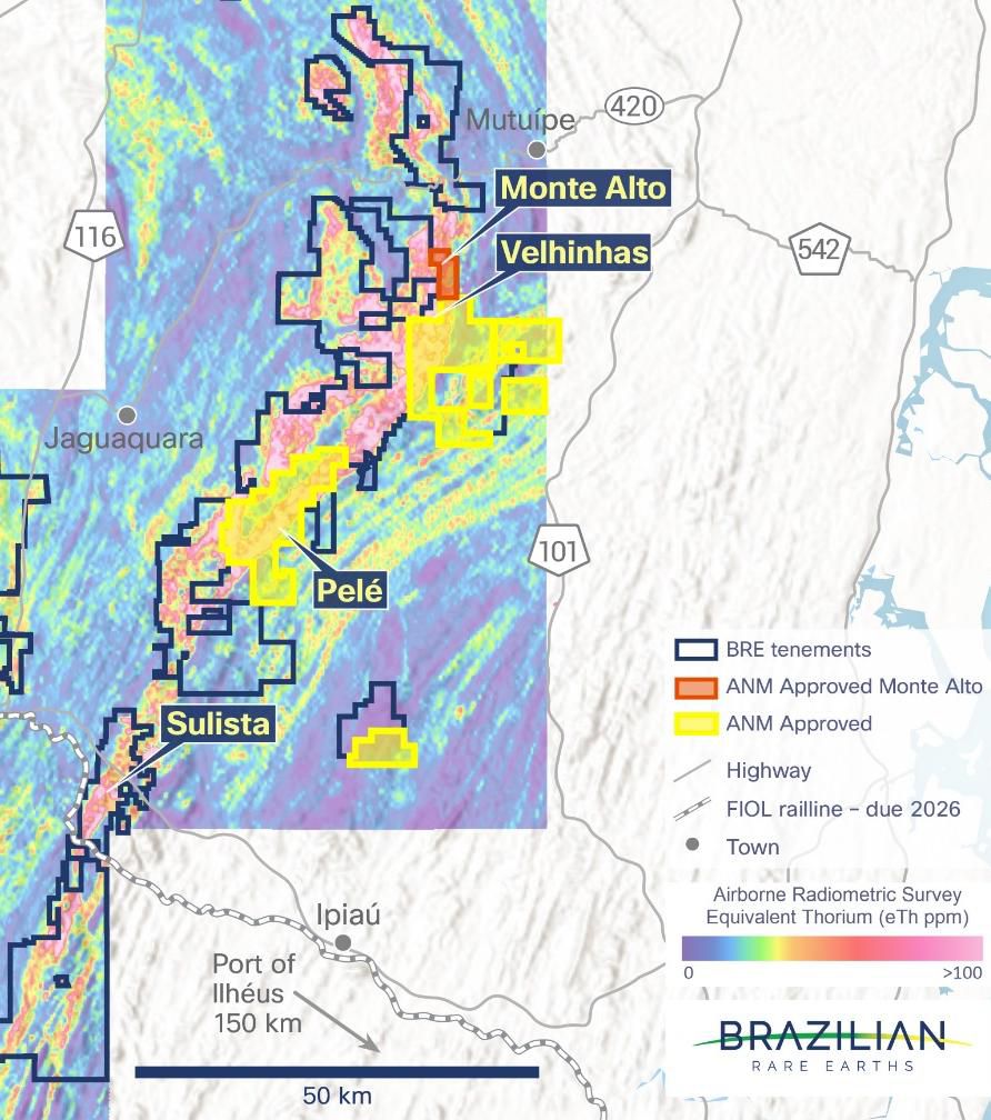The approvals include the southern extension of the Velhinhas trend, where the highest-grade outcrop sample recorded at 40.5% TREO was recorded. The central block of the ANM approvals, spanning 128 km2, covers a chain of intense geophysical anomalies over Pele Targets 2, 3, 4, and 5.