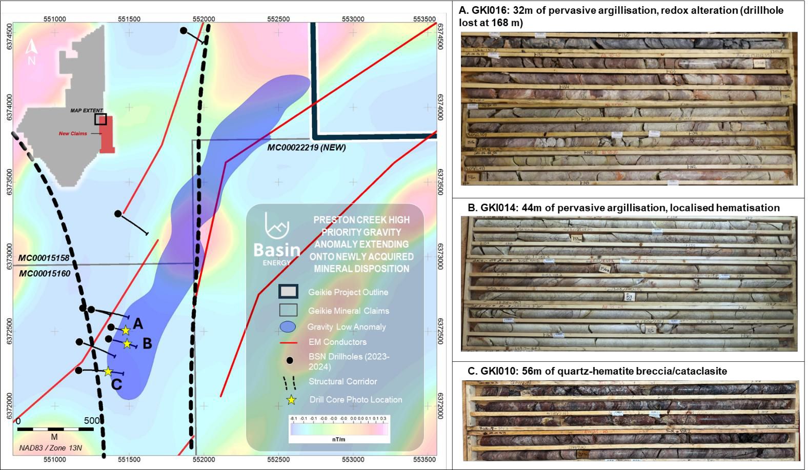 "We are very pleased with the acquisition of these new claims contiguous to the highly prospective Preston Creek prospect at Geikie. 2024 drilling at Preston Creek highlighted a spectacular structure-related alteration system with uranium anomalism. This 1.5 km strike gravity anomaly, which remains untested to the northeast into the newly staked claims exhibits all the key elements typically found in basement-hosted high-grade uranium mineralisation. Securing the tenures contiguous to this system is a fantastic addition to the Geikie project."