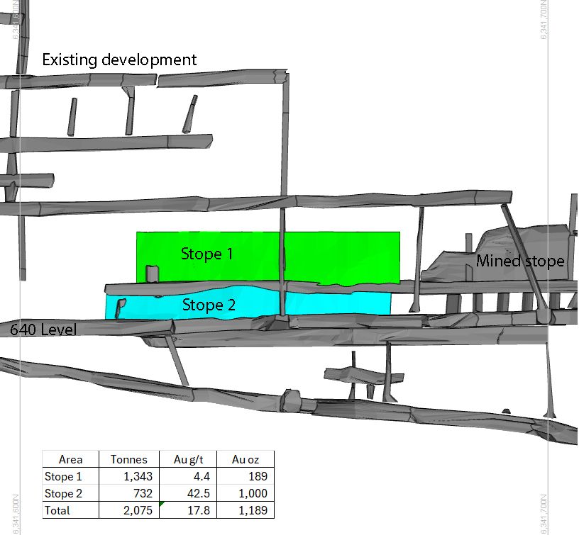 The stopes were developed by a previous operator and are accessible from existing development. The additional stope blocks contain an Inferred Resource of 2,075 tonnes at 17.8 g/t Au containing 1,189 ounces of gold with the lower block having over 700 tonnes at 42.5 g/t. The planned stope width is the same as the interpretation of the mineralisation. These stopes forms part of the Mineral Resource Estimate reported in VTX Announcement 22 June 2023. They were not included in the production forecast detailed in the 2024 Pre-Feasibility Study (Announcement 3 January 2024). This was due to the complexity of existing airleg workings and uncertainty around access and ground conditions, which established these areas into an Inferred Resource Category.