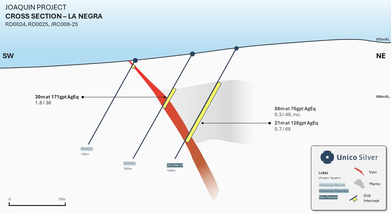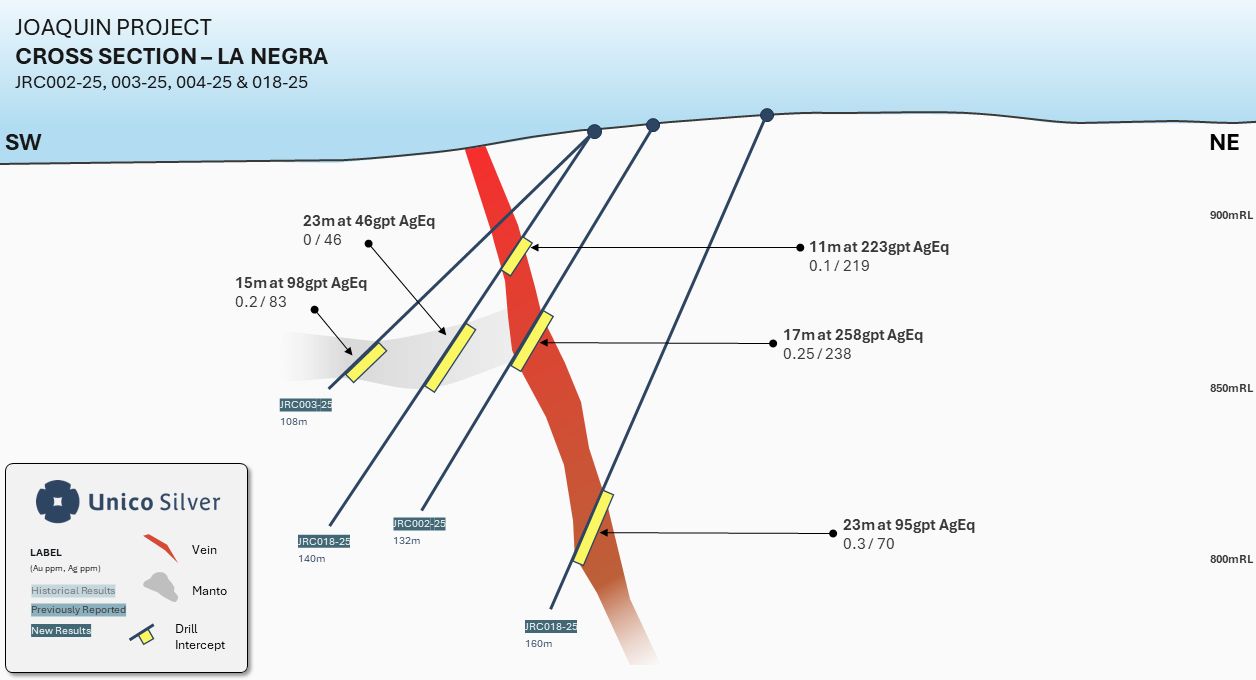 - (JRC017-25) 23m at 268gpt AgEq (238gpt Ag, 0.38gpt Au) from 98m, inc. (6,173 GT) 3m at 1189gpt AgEq (1109gpt Ag, 1.0gpt Au) from 105m