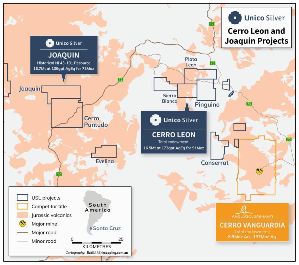 Unico Silver holds 100% of the Cerro Leon and Joaquin silver gold districts located in the central Deseado Massif geological province, Santa Cruz Argentina (Figure 6*).