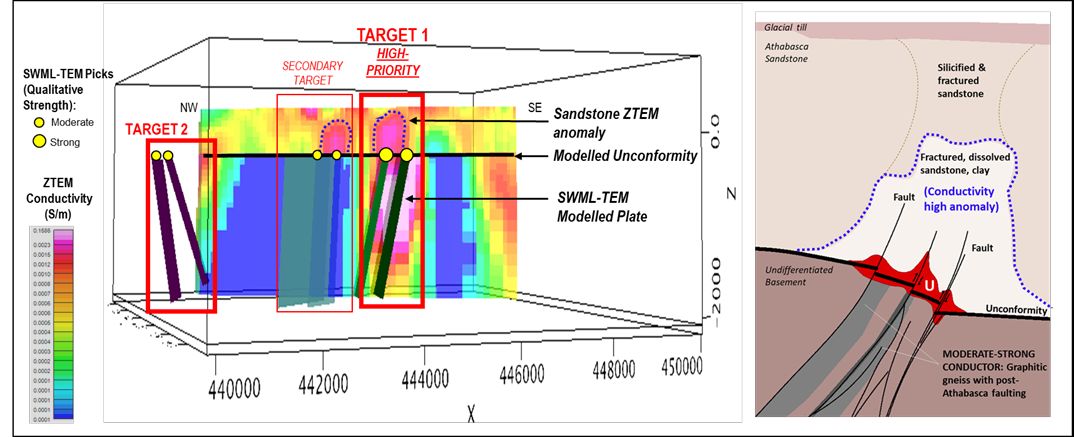 In 2024, ground electromagnetics ("EM") at Marshall identified three main targets which confirms the geological and exploration model. Of note is Target 1, refer to Figure 2*, where modelled EM plates below the unconformity align with a sandstone Z-Tipper Axis Electromagnetic ("ZTEM") anomaly, which is interpreted to be alteration within sandstone. The identification of these targets is encouraging and consistent with regional trends in the southeastern Athabasca and provides increased confidence in drill hole targeting.
