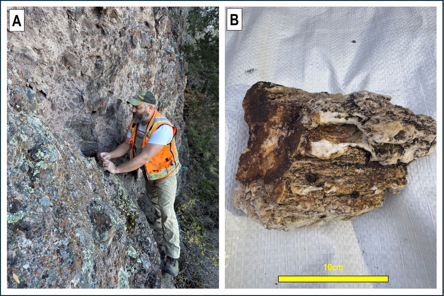 Red Mountain's southern claims area sits higher within the Tertiary volcanic sequence than the northern claims area, with exposures of pre-Quarternary geology comprising the late Tertiary volcanic and sedimentary units that overly the basal volcaniclastic and fluvial sediments of the Flagstaff Formation (Figure 2*). However, it is considered likely that The Flagstaff Formation, including the tuffaceous volcaniclastic units that host antimony mineralisation at Antimony Canyon, extend into the Company's southern claims at relatively shallow depths. Where Tertiary volcanic basement is exposed in the southern claims area, it typically occurs as steep, fault-controlled exposures of volcanic breccias and welded tuffs showing pervasive silicification and patchy iron-oxide alteration (Figure 4A*), and local zones of strong fault-controlled quartz veining (Figure 4B), which is consistent with the upper portion of an epithermal system, suggesting excellent potential for concealed antimony mineralisation at depth.