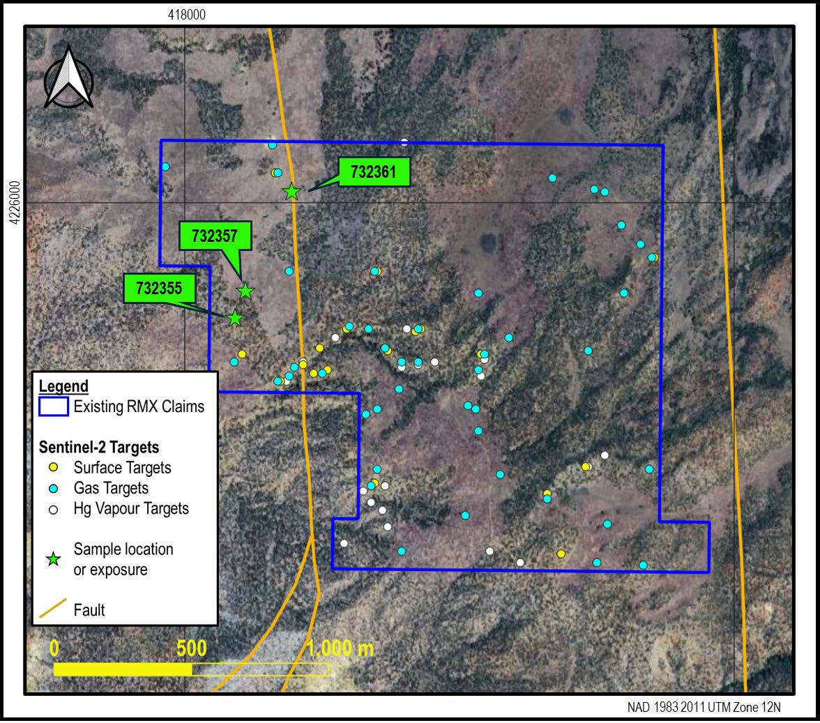 Mapping in the northern claim block confirmed the presence of similar host rocks as the principal host units for mineralisation at Antimony Canyon (Figure 1A*). RMX's field team also observed alteration consistent with the presence of significant epithermal system within the claims, including widespread pervasive argillic alteration (Figure 1C*) and silicification, and more localised development of oxidised breccias (Figure 1B*) and quartz vein stockworks. Alteration zones are structurally controlled by northwest trending faults, which are interpreted to represent similar Fault splays to the structures that fundamentally control hydrothermal fluid flow and high-grade antimony mineralisation at Antimony Canyon.