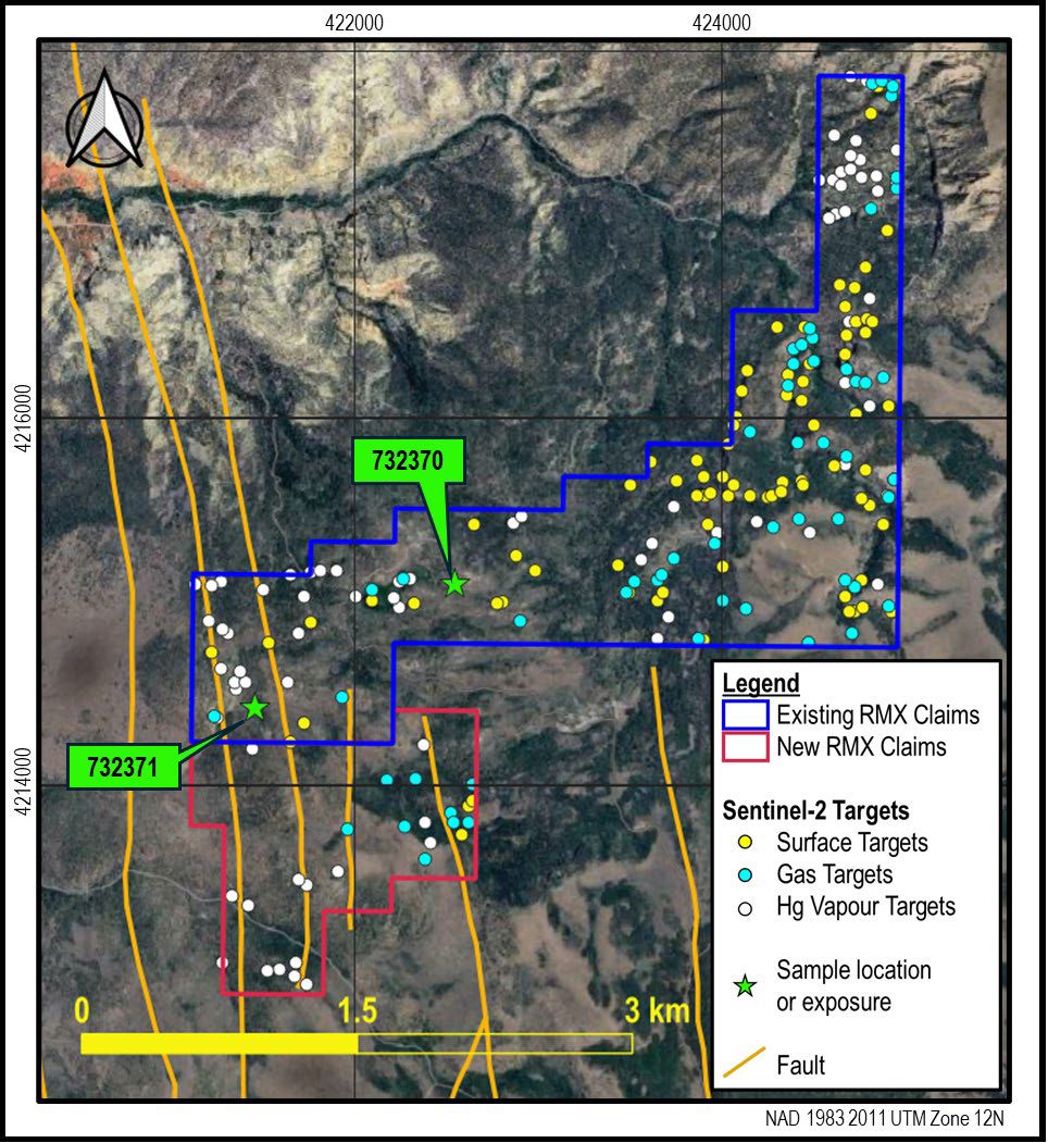 Using multiple spectral features for mercury vapour that are detectable in Sentinel-2 data, Dirt mapped the 100 strongest "Hg Vapour Targets" across Red Mountain's claims, which are also shown in Figures 5* and 6*. Like the Gas Targets, the Hg Vapour Targets are present in both outcropping and covered areas across the Company's claims, although in areas of Quarternary cover, for example in the western portion of the southern claim area and within the new claim area, they appear to be preferentially developed along and close to mapped faults (Figure 6*). This relationship is consistent with the interpreted fundamental structural control on antimony mineralisation in the district.