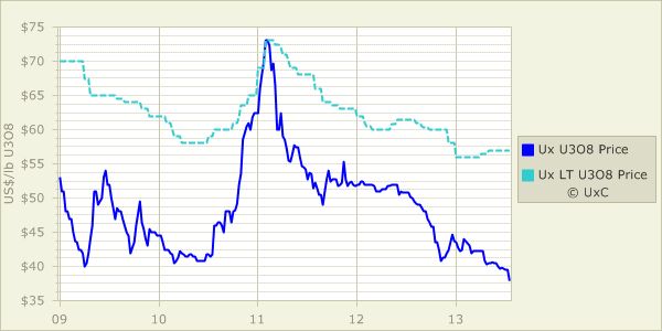 - The spot price for uranium at the end of the June quarter was US$39.00/lb U3O8 and drifted downwards in early July to below US$37/lb. The long term price remains steady at around US$57/lb.