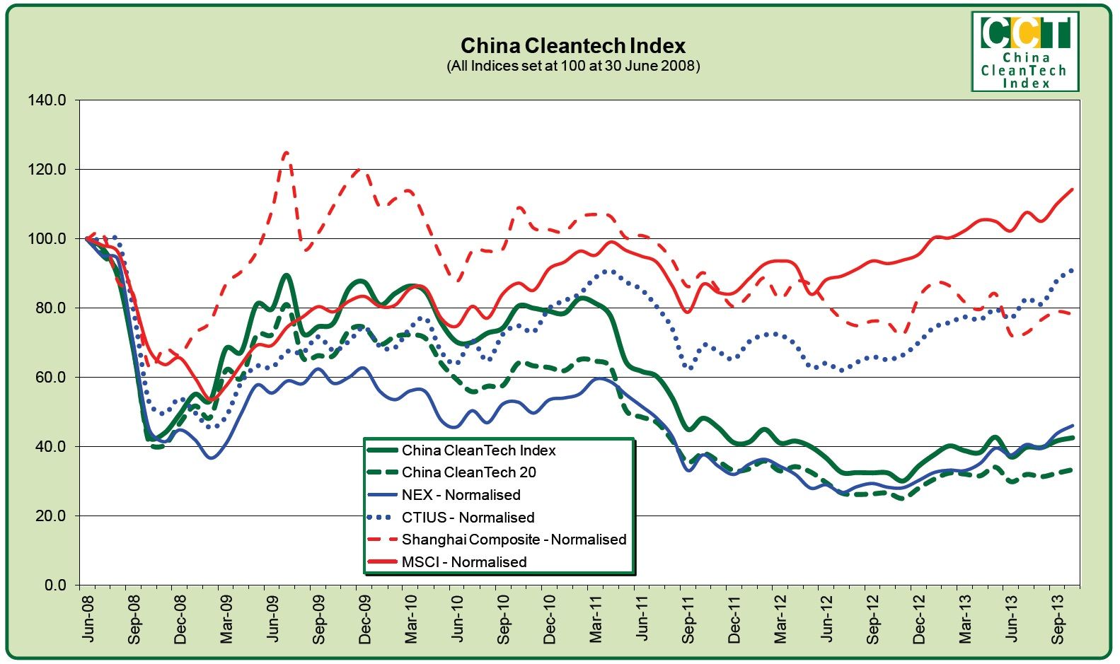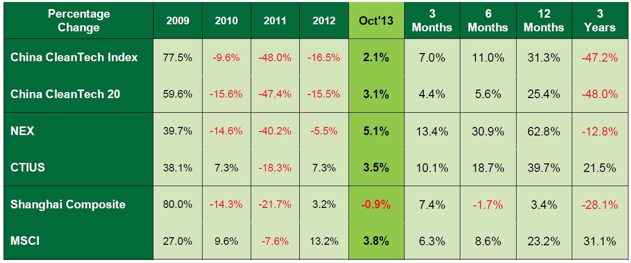 --------------------------------------------------------Percentage Change 2009 2010 2011 2012 --------------------------------------------------------China CleanTech Index 77.5% -9.6% -48.0% -16.5% China CleanTech 20 59.6% -15.6% -47.4% -15.5% NEX 39.7% -14.6% -40.2% -5.5% CTIUS 38.1% 7.3% -18.3% 7.3% Shanghai Composite 80.0% -14.3% -21.7% 3.2% MSCI 27.0% 9.6% -7.6% 13.2% ----------------------------------------------------------------------------------------------------------------Percentage Change OCT'13 3 Mths 6 Mths 12 Mths 3 Yrs--------------------------------------------------------China CleanTech Index 2.1% 7.0% 11.0% 31.3% -47.2%China CleanTech 20 3.1% 4.4% 5.6% 25.4% -48.0%NEX 5.1% 13.4% 30.9% 62.8% -12.8%CTIUS 3.5% 10.1% 18.7% 39.7% 21.5%Shanghai Composite -0.9% 7.4% -1.7% 3.4% -28.1%MSCI 3.8% 6.3% 8.6% 23.2% 31.1%--------------------------------------------------------