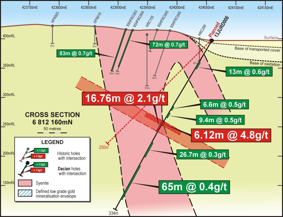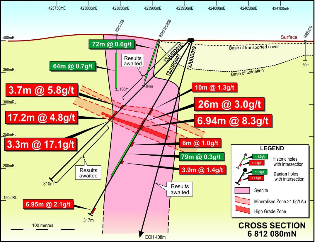 The mineralisation is located approximately 50m west of the high grade result returned in 13JURD007 and is interpreted to correlate with the lode structure intersected in the three previously reported Dacian holes which include: