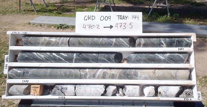 --------------------------------------------------------Hole ID East North RL Grid Collar Collar Total (m) (m)(m) Azimuth Incl. Depth(m)--------------------------------------------------------GHD009 583444 6104587 387 MGA94 29* -60 1312.6m Zone 55GHD010 583448 6104593 387 MGA94 120 -55 740.3m Zone 55GHD011 583445 6104592 387 MGA94 41 -55 969.6m Zone 55 --------------------------------------------------------