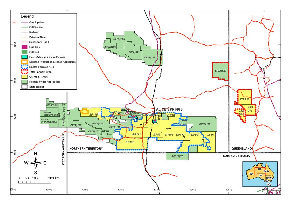 (Santos spending up to A$150 million in a farm-in program to further exploration and potential development of up to 13 permit/application areas in the Amadeus and Pedirka Basins in central Australia).