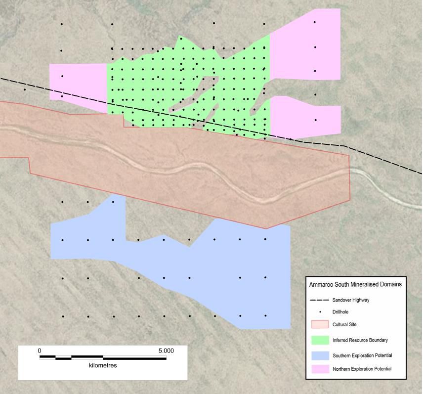 The Ammaroo South Resource is surrounded by an area of exploration potential (shown in pink in Figure 2 in link below) in which there is insufficient data to yet define a Mineral Resource. A second area of exploration potential is interpreted south of the cultural exclusion zone (shown in blue in Figure 2 in link below). Drilling in these areas is generally spaced at around 1 km to 2 km by 1 km by 1.5 km and broader.