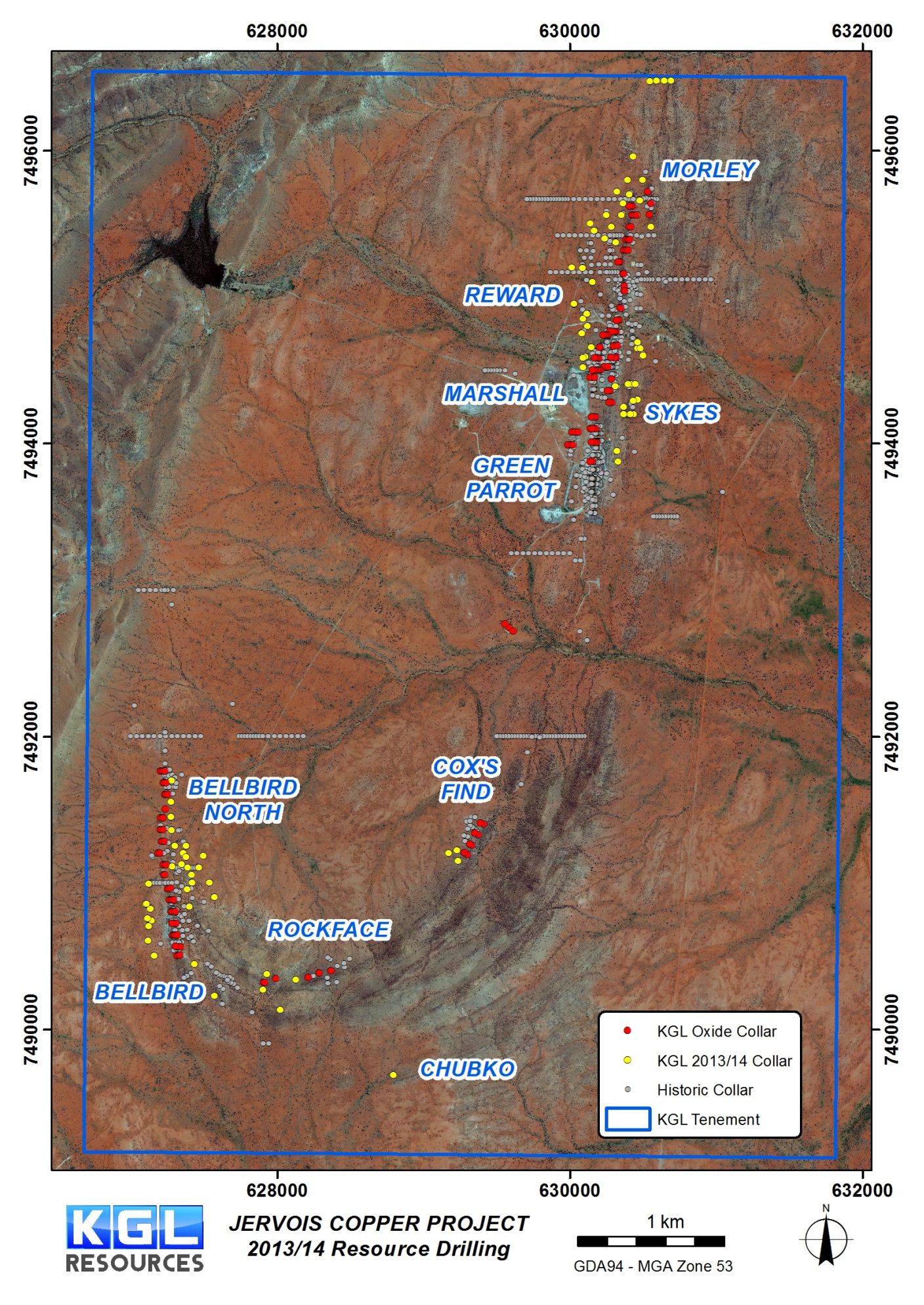 Simon Milroy the managing director of KGL Resources comments "These results are building our confidence in the continuity of mineralisation throughout the mine sequence from our northern tenement boundary around the "J shaped" outcrop to north of Bellbird North. This makes the area between the southern end of Green Parrot and Cox's Find, that is largely under cover and effectively untested, especially interesting."