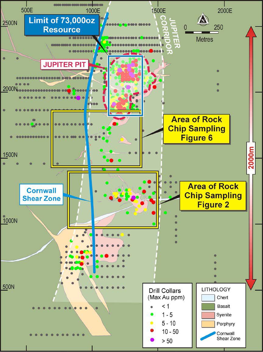 The rock-chip sampling program identified significant levels of gold mineralisation over rocky and steep-sided outcropping syenite that was unable to be drill tested as part of the recently completed 56 hole, 7000m RC drilling program testing for open pit potential at Jupiter.