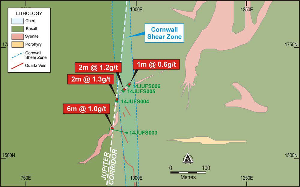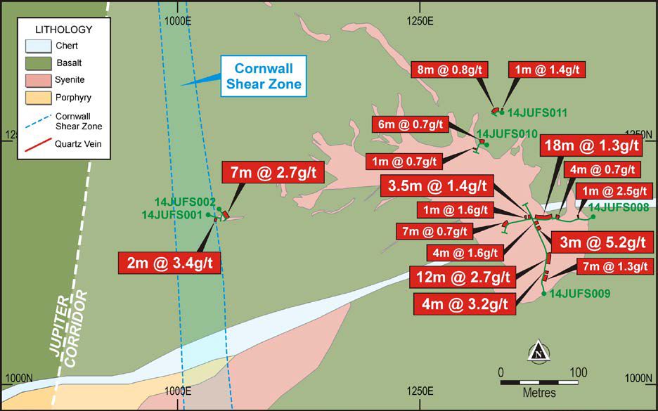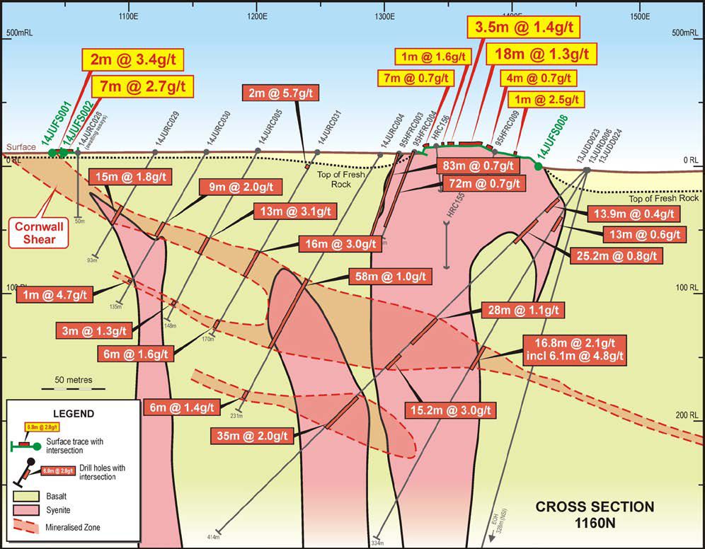 14JUFS008 was sampled east-west over a length of 107m (see Figure 2) and has defined continuous zones of syenite hosted gold mineralisation at Heffernans, including: