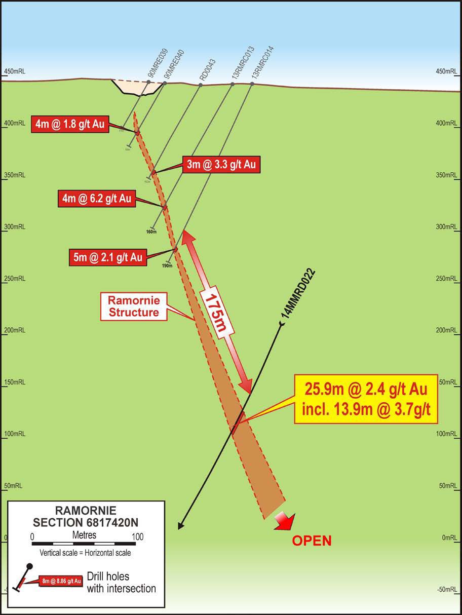 The intersection also confirms excellent potential exists for discovering new mineralisation immediately beneath the 700m strike extent of the Ramornie Structure which is host to two small historically mined open pits (see Figure 1). The geology observed in the 14MMRD022 intersection is very similar in appearance to the biotite-pyrite altered shear zone seen in the open pits, and along the 2km trend defined as the Transvaal - Ramornie Corridor (see also Figure 1 in link below).