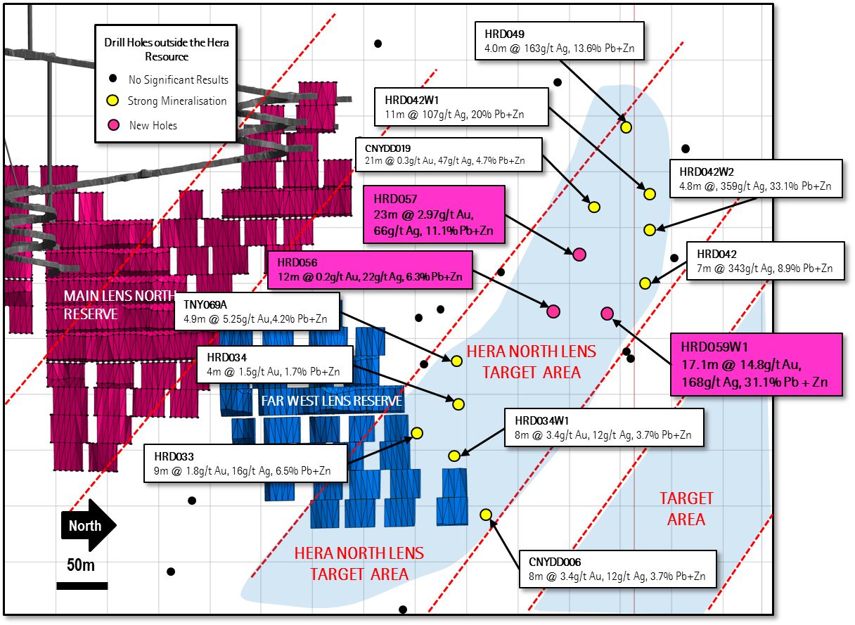 - Significant exploration results highlight high grade extensions north and south of the Hera deposit