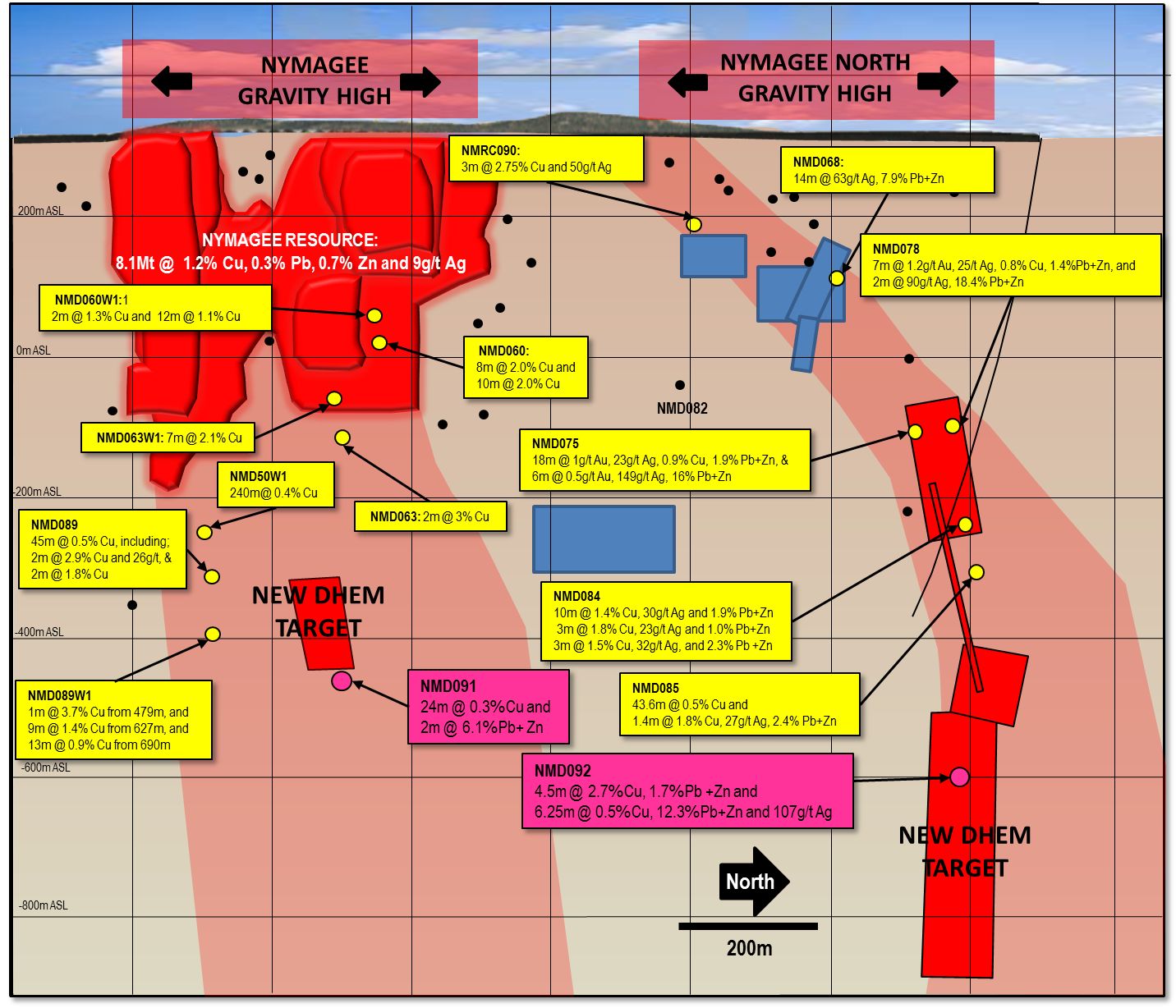 - Assay results from massive sulphide intersected at the Nymagee Copper Project (hole NMD092) were received in the quarter confirming the strong tenor of the Nymagee North mineralisation, with results including: