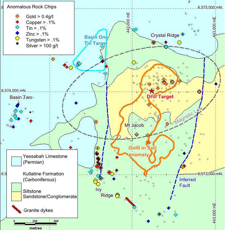 Tin anomalies are not confined to the Basin One substantial tin plus copper target area reported previously by Thomson, but extend east to Crystal Ridge, west to Basin Two and south to Ivy Ridge. The anomalous system now measures 2.5km by 2.5km.