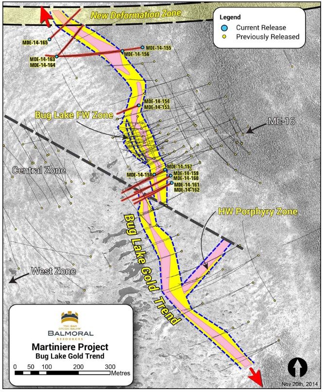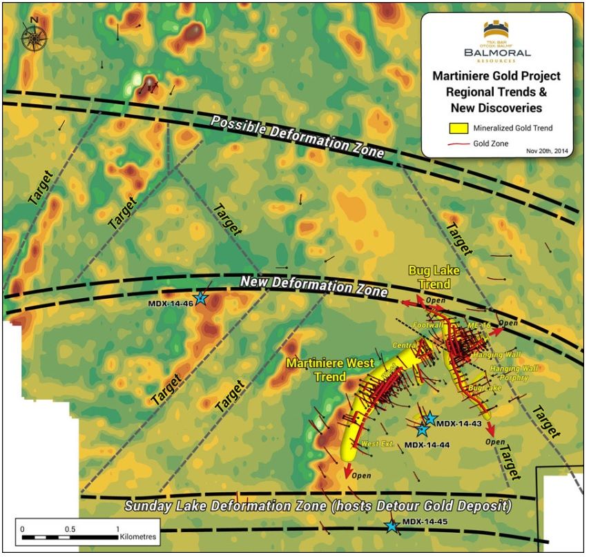 BALMF:OTCMKTS) reported final results from the 2014 summer drill program on the Company's wholly owned Martiniere Property in Quebec. Results from 13 holes along the Bug Lake Trend were reported, 7 from the northern extension of the Trend and 6 from the fault offset area which separates the northern and southern segments of the Bug Lake Gold Zone. Highlights include the extension of the Bug Lake Trend by 250 metres to the north-northwest, discovery of high-grade gold mineralization in a new, east-west trending (Sunday Lake parallel) deformation zone and a near surface intercept of 14.78 g/t gold over 2.66 metres from the northern extension of the Hanging Wall sub-zone.