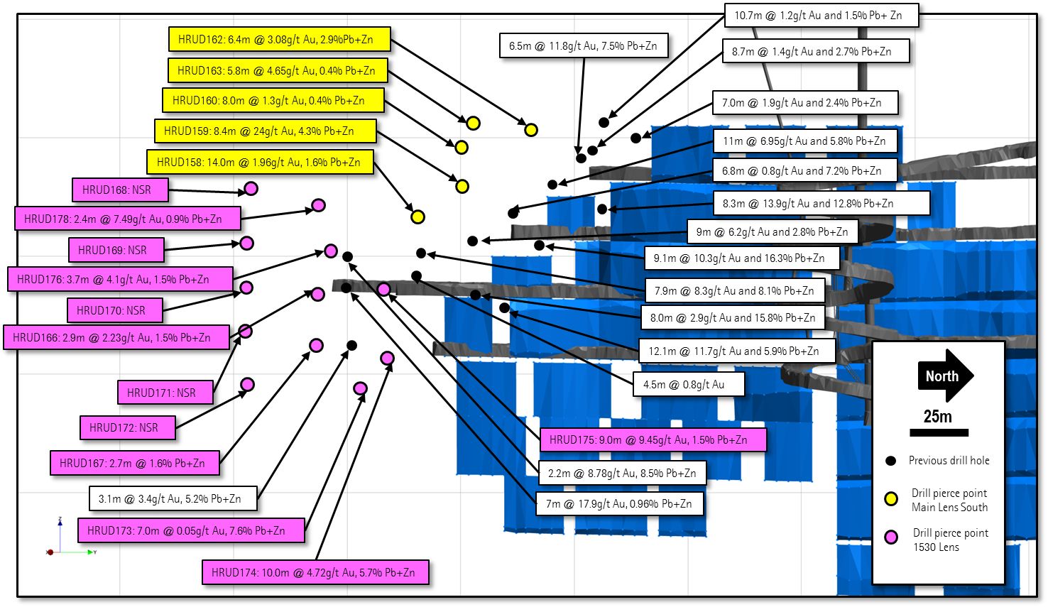 - HRUD175: 8.0m @ 11.7g/t Au and 3.5% Pb+Zn