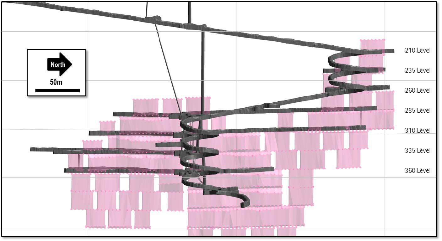 Strong underground development rates continued through November and December with total linear development now at 6,409m. Seven separate production levels are now fully or partially established and the mine is now transitioning to full scale production from development stopes commencing on the 205 and 230 levels (refer long section below).