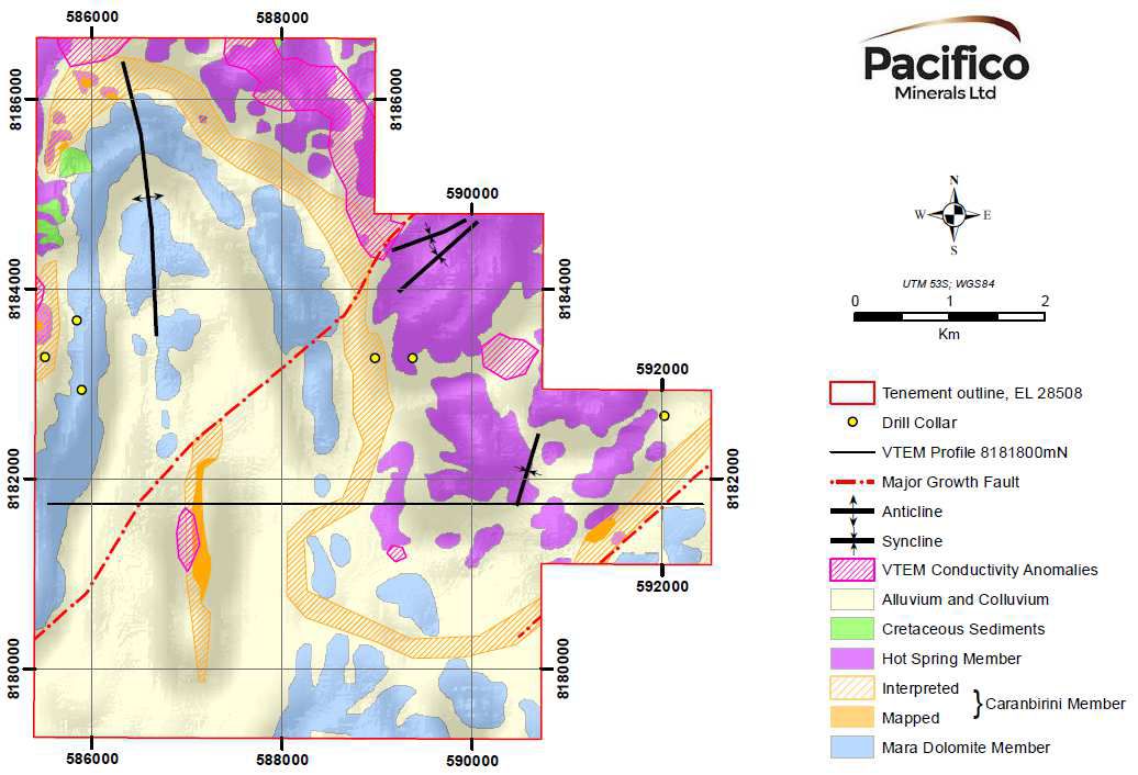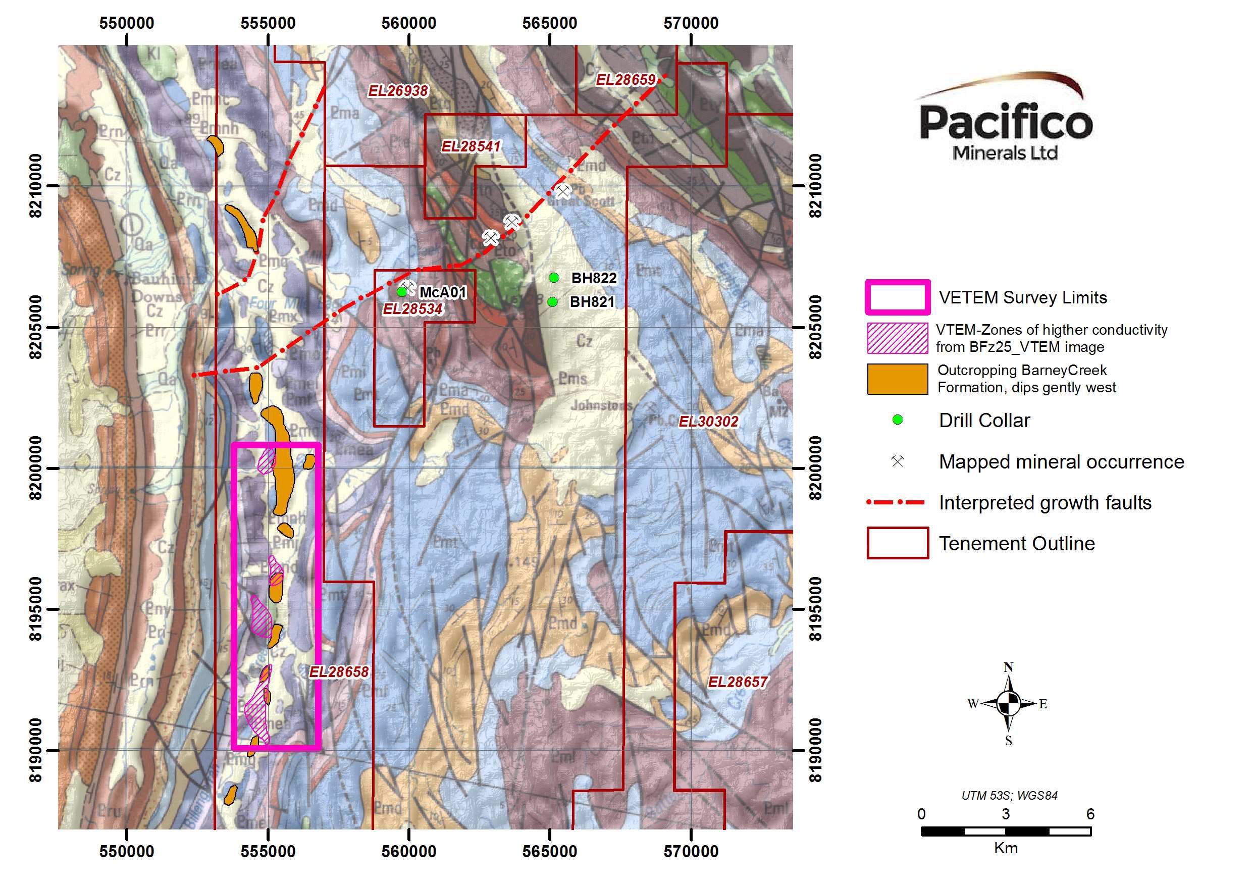The Barney Creek Formation within the Berjaya tenement has been indicated in previous drilling by Mount Isa Mines Ltd, geological mapping by BHP Minerals Pty Ltd ("BHP"), the recent VTEM survey flown for Pacifico, and mapping by Pacifico of parts of the regional stratigraphy. Major north-east trending growth faults are indicated by the geological mapping, and confirmed by the VTEM survey (see Figures 2 and 3).