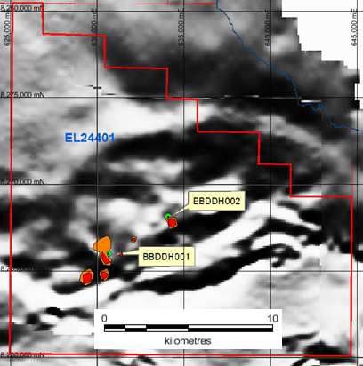 Drilling within the licence, by BHP has recorded intersections of trachytes in the basement. In the Redbank area of the Northern Territory, copper mineralisation is contained in pipe shaped bodies associated with trachytes and trachy-andesite lavas