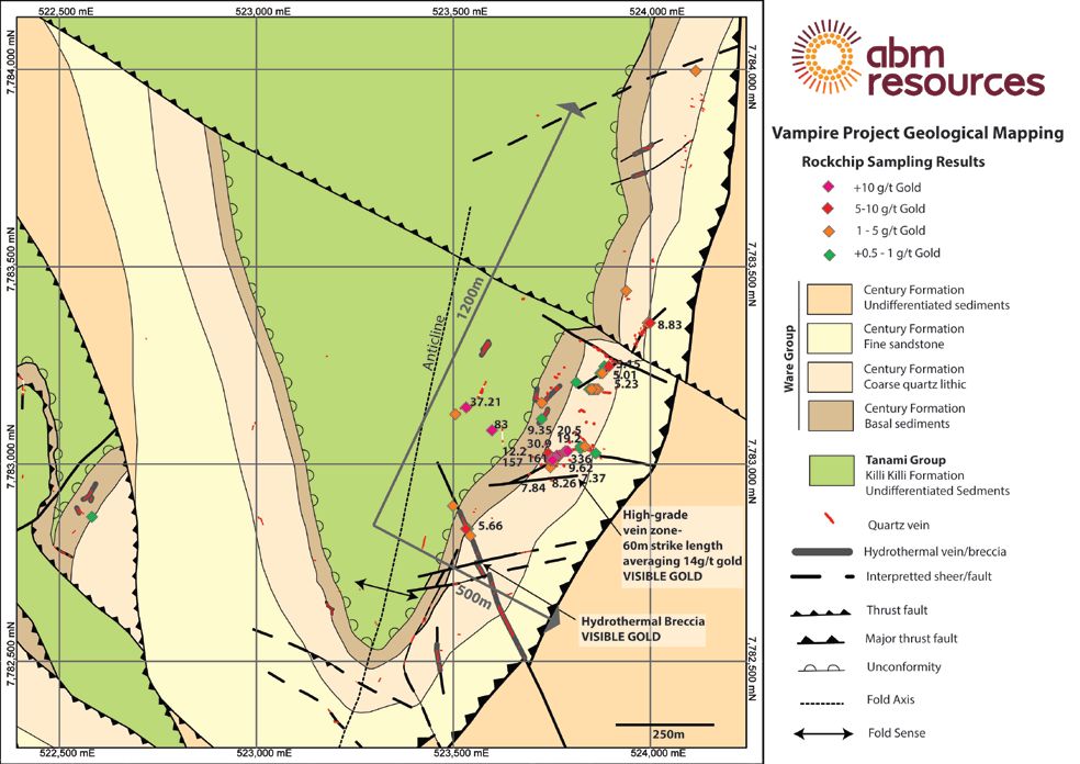 Recently ABM has been mapping and sampling the wider area. Several samples of quartz vein with visible gold have been collected. Quartz hydrothermal breccia associated with mineralised structures have also been observed. The mineralised quartz veins and hydrothermal breccias at Vampire are now mapped sporadically over a widespread area of approximately 1,200 metres by 500 metres.