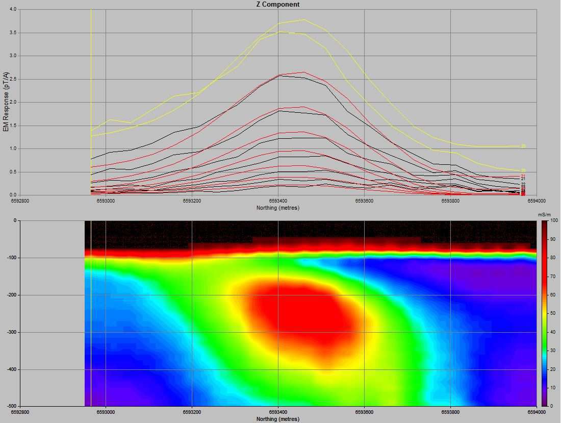 The moving loop EM ground survey provided higher resolution information to greater depths. The results from the new survey define the conductor more effectively owing to its greater depth penetration. In addition we now have better definition on its orientation which is thought to be striking NE-SW and dipping southeast. Independent modelling has fitted a NE-SW striking and southeast dipping conductor plate to the data, significantly different to initial VTEM modelling, and consistent with a peak magnetic response. The target conductor has not been tested by historic holes in the vicinity, namely 71W1 and 78WD01.