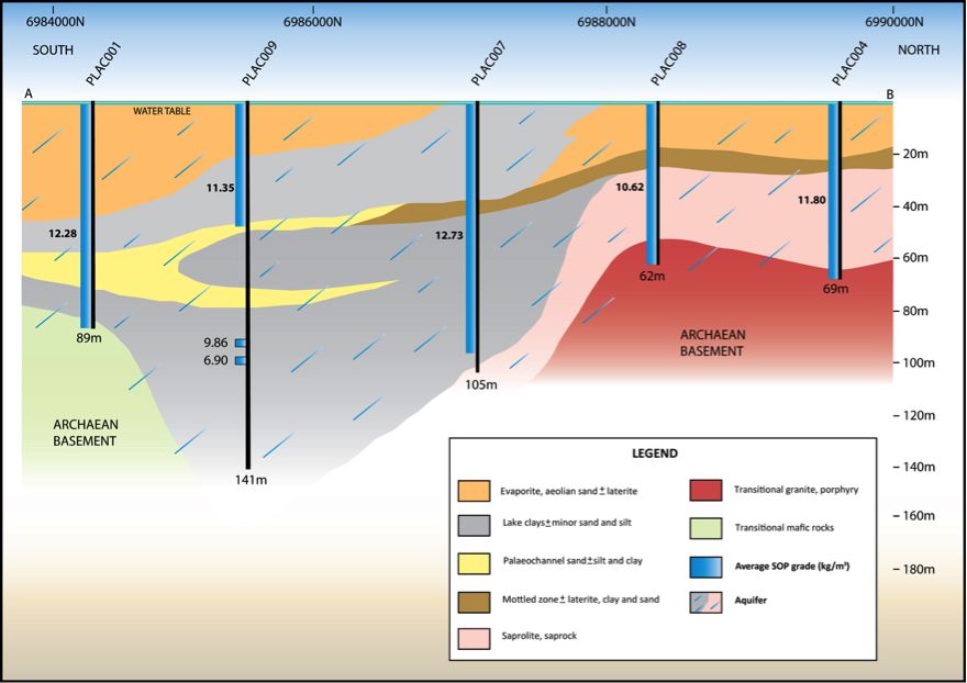Lithology types logged included surficial or near surface evaporite and sand/silt, silcrete+/-laterite, common lake clays with some well sorted sand units, puggy lacustrine clays with minor sand/silt and Archaean basement rocks including transitional porphyry, granite, ultramafic and amphibolite types. It is encouraging to note significant potash brine grades were also encountered in the weathered basement at and near the bottom of some holes.