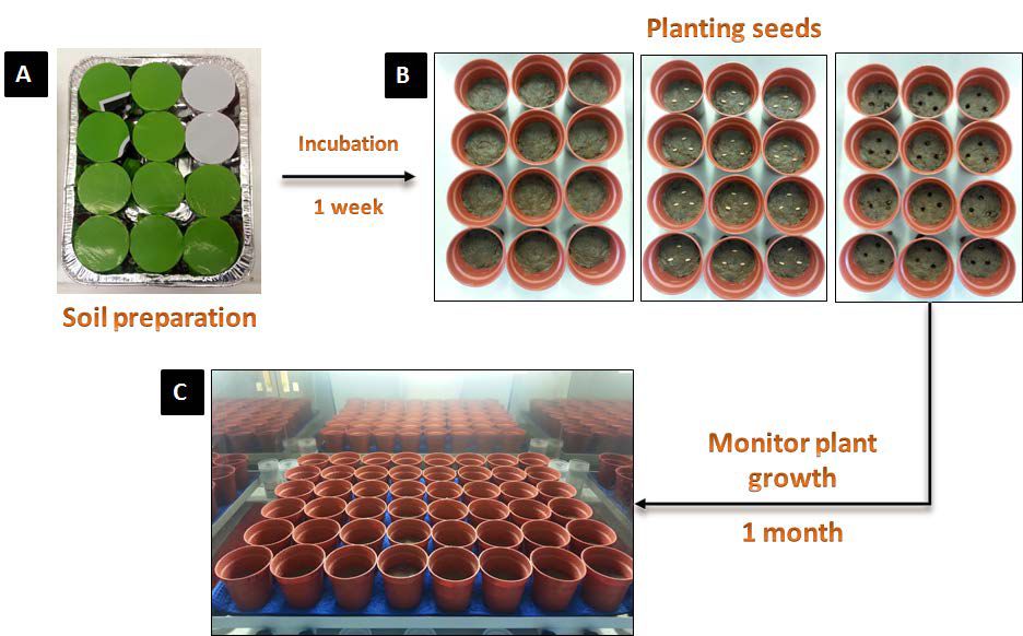 For the plant trials, 3 grains of wheat were placed into each pot. The soil (120g) was spiked with different amounts of Sugarloaf carbon (7.5, 15 and 30g). The soil content (80 g) was fixed at a relative humidity of 20 % and incubated at a temperature of 25deg C. The soil was watered everyday with distilled (DI) water and the release of nutrients in the soil was measured at certain time intervals (7, 14, 21 and 28 days) for a period of 1 month.