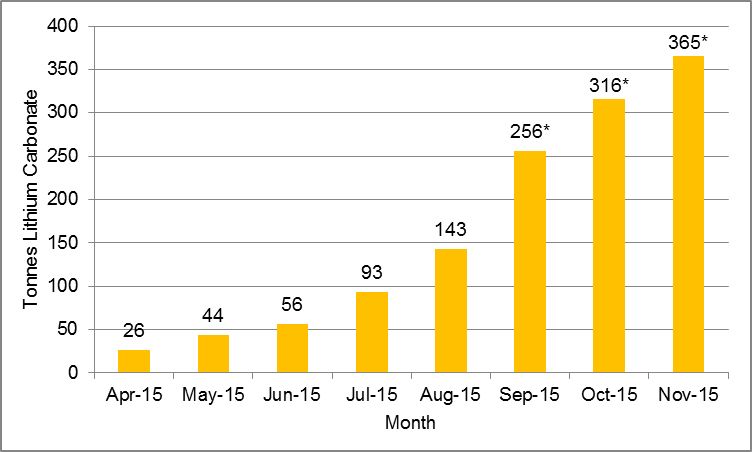 - Production of 365 tonnes of lithium carbonate was achieved in November, an increase of 49 tonnes over October.