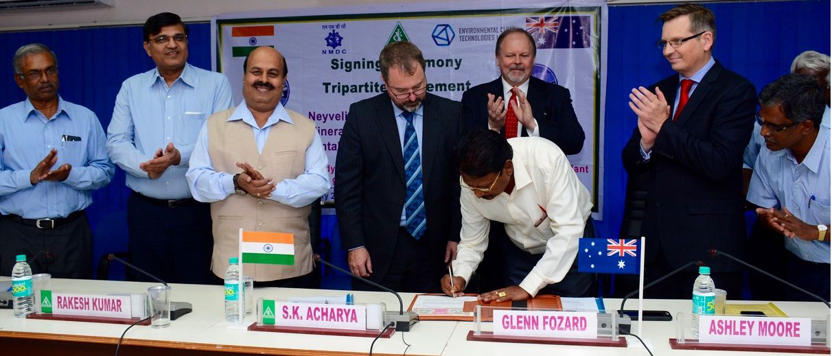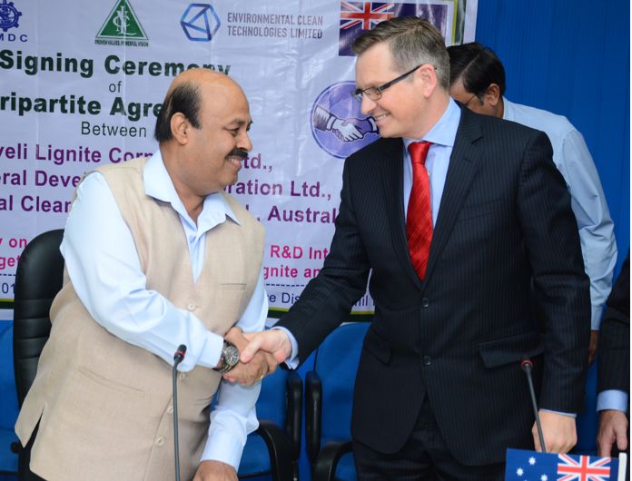 NLC's Chairman and Managing Director, Mr S. K. Acharya delivered a forward looking speech during the signing ceremony, outlining his company's vision for moving its lignite resource up the value chain and mitigating emissions. He commented specifically that, as the process is suitable for purifying iron from the low grade iron ore, using easily available lignite, the exchange of technical know-how between India and Australia will benefit the companies as well as the countries.