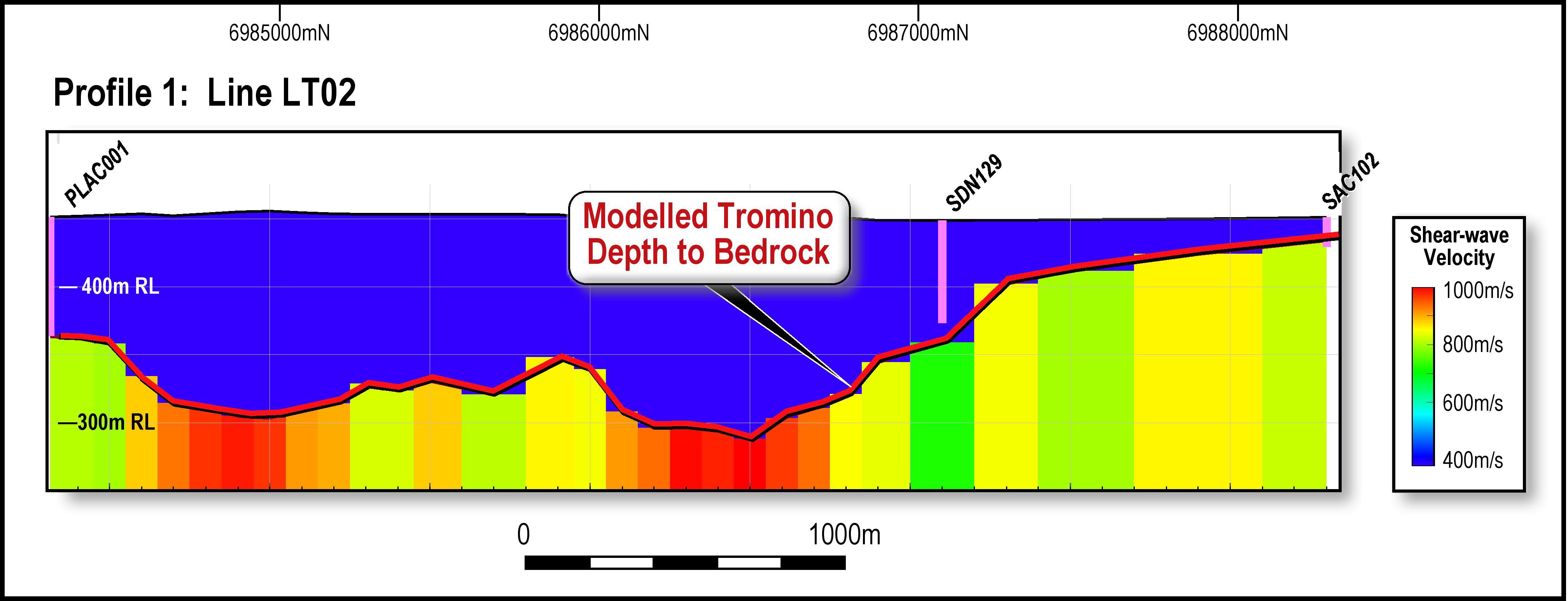 The section line spacing was approximately 1,200m with station centres at 100m-200m. The peak H/V (Horizontal/Vertical) frequencies show an excellent correlation coefficient and also show very uniform shear wave velocity in the palaeovalley fill.