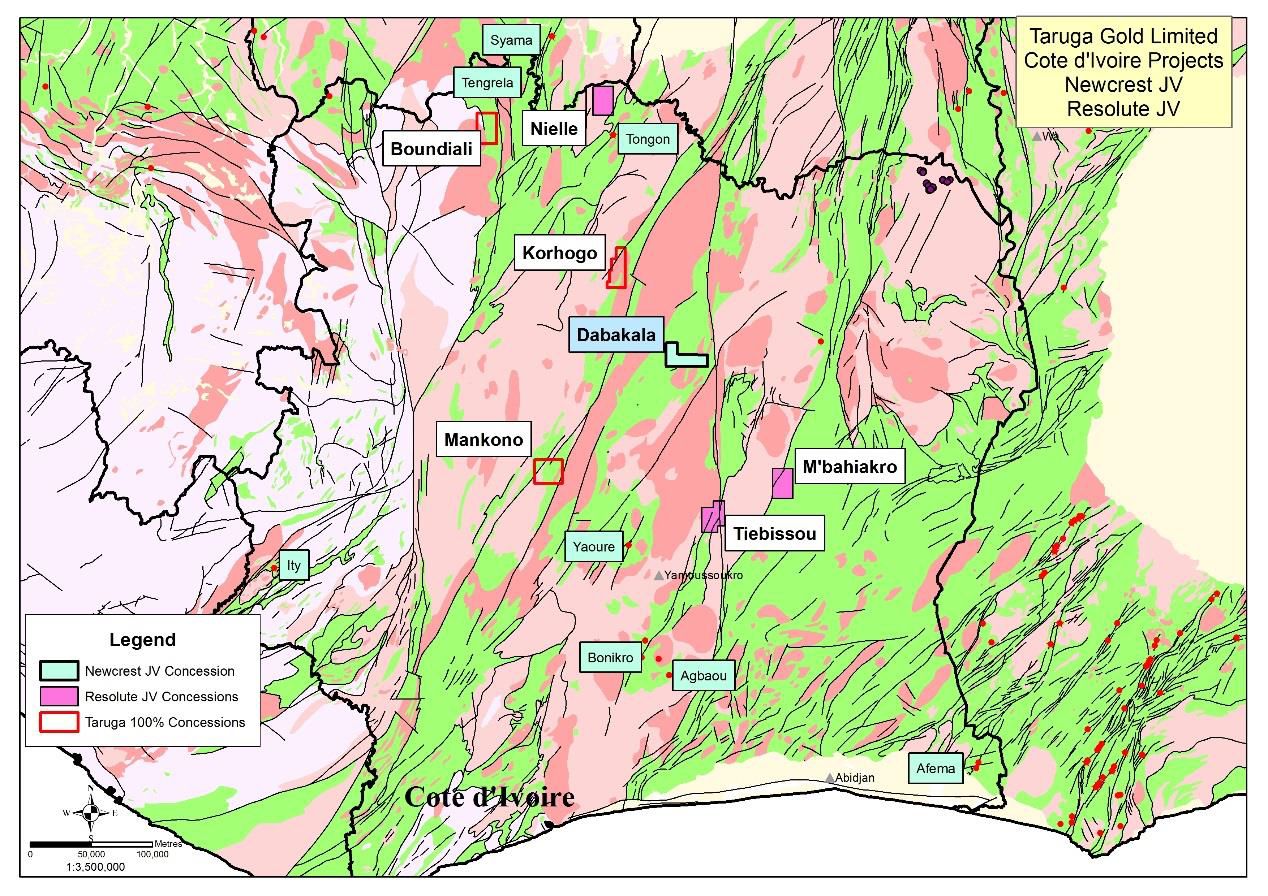 The Binding Farm-in agreement with Newcrest for the Dabakala concession was finalised during the quarter. The Dabakala concession, located in central Cote d'Ivoire, is 100% owned by Taruga and adjoins concessions owned by Newcrest (Figure 2). Under the terms of the agreement, Newcrest will have the ability to earn a 75% interest in a JV company in Cote d'Ivoire by incurring exploration expenditure of US$1.7m over three years.