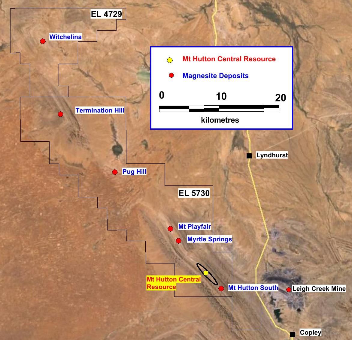 The Leigh Creek Magnesite Project comprises the Mount Hutton South, Mount Hutton Central, Mt Playfair, Pug Hill, Termination and Witchelina deposits. The Mineral Resources for each deposit are shown below. It is expected that the Mount Hutton Central deposit will first be the first area developed, as such the remaining deposits have not yet been upgraded to 2012 JORC code requirements on the basis that the supporting information available regarding these deposits has not materially changed since they were last reported.