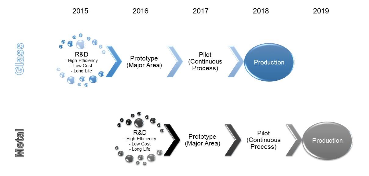 Metals are technically more challenging for a number of good (and confidential) reasons which, inter alia, relate to the opacity of metal. We have adopted a different material set and architecture from glass substrate strip cells, where we are currently generating strip cell efficiencies of 12% to 13%. The steel substrate architecture is seeking to eliminate any significant organic material content. Moreover, the current product development plans emerging from our activities at Solliance at Eindhoven, The Netherlands will allow for different substrates, including titanium and aluminium. This parallel metals focus is globally unique to Dyesol in PV development and, again, attracting strong leads and enquiry from global materials groups.