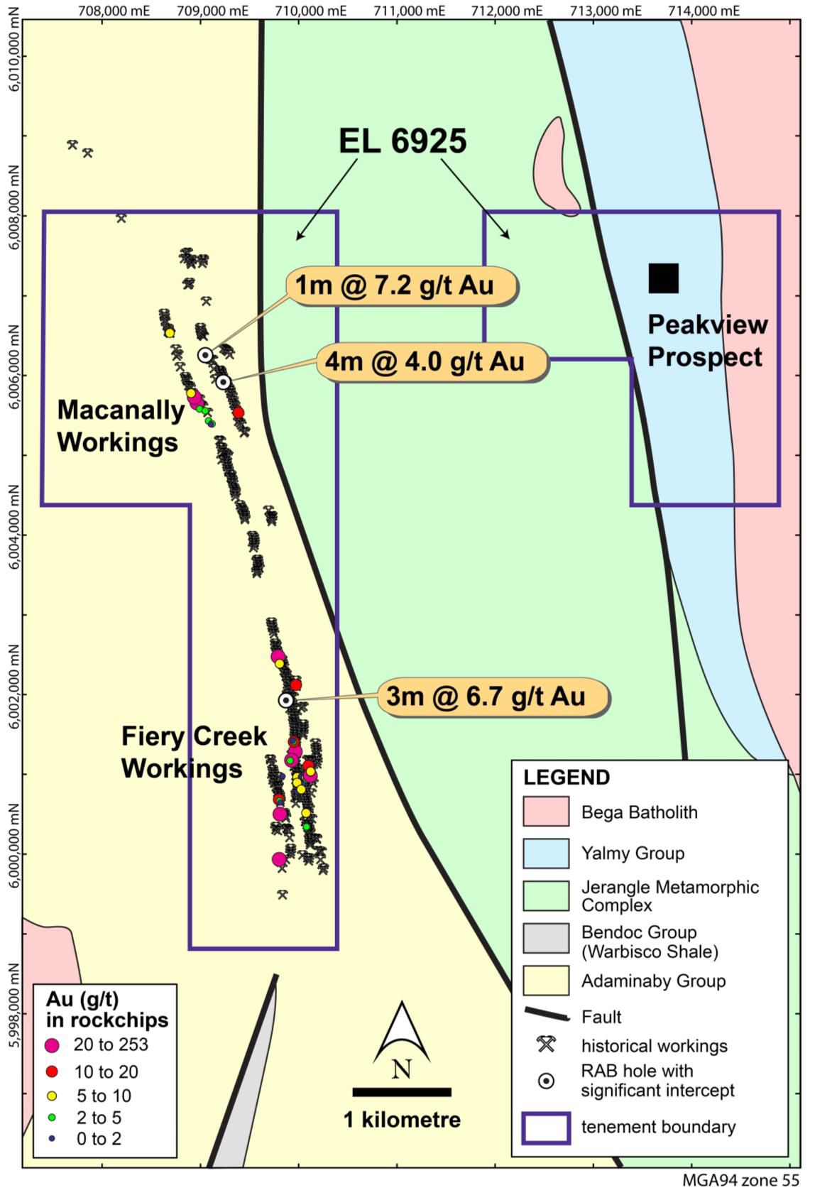 The Fiery Creek Project contains the historic Fiery Creek and Macanally gold and copper workings, which extend over a strike length of more than 8.5km. The project is located within EL 6925 which contains both the Fiery Creek Project and the Peakview base metal prospect (Figure 2).