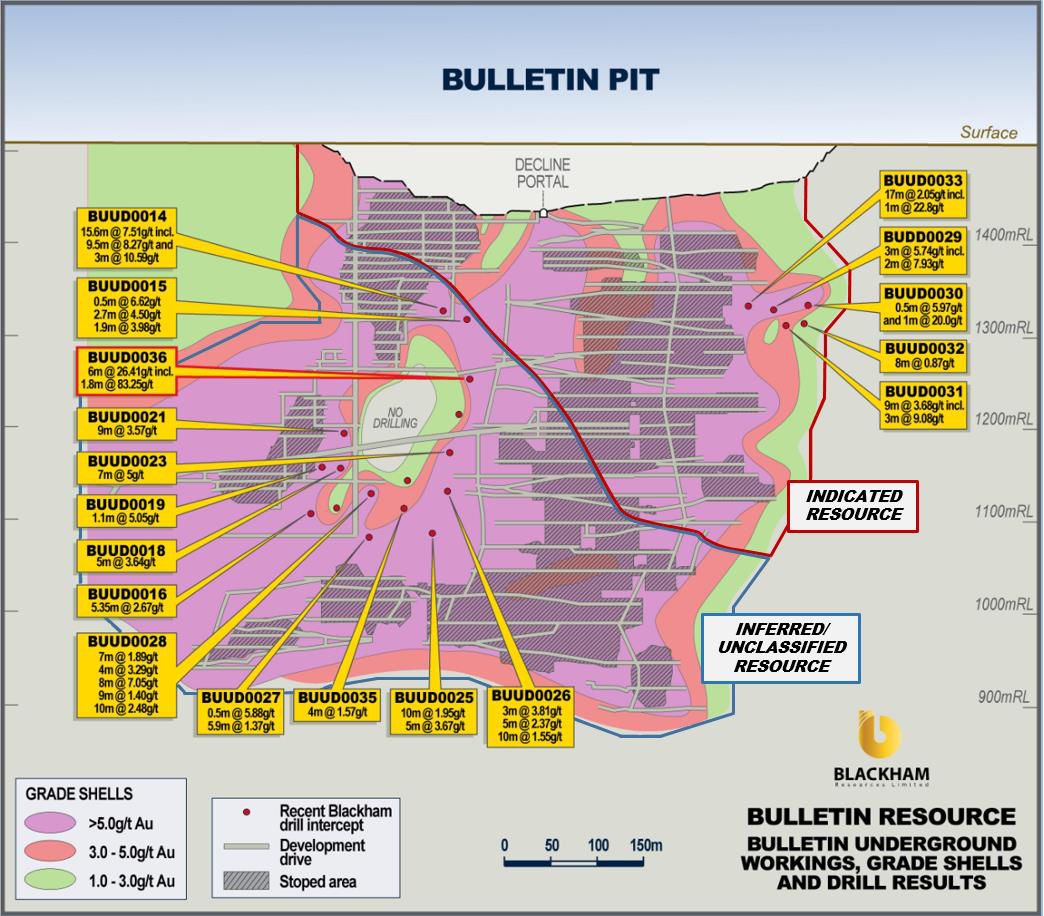 Blackham's drilling has established gold continuity in the area between the high grade historical stopes and is expected to upgrade the resource in the area to Indicated from areas that were either Inferred or unclassified. Blackham's strategy is to identify shallow ore reserves within 500m from surface. These high-grade results come from an area situated only 400m below surface. The Bulletin orebody remains accessible via the Bulletin portal and decline.