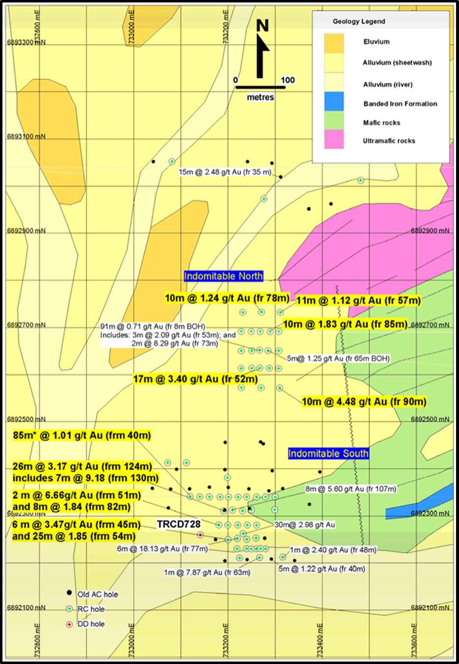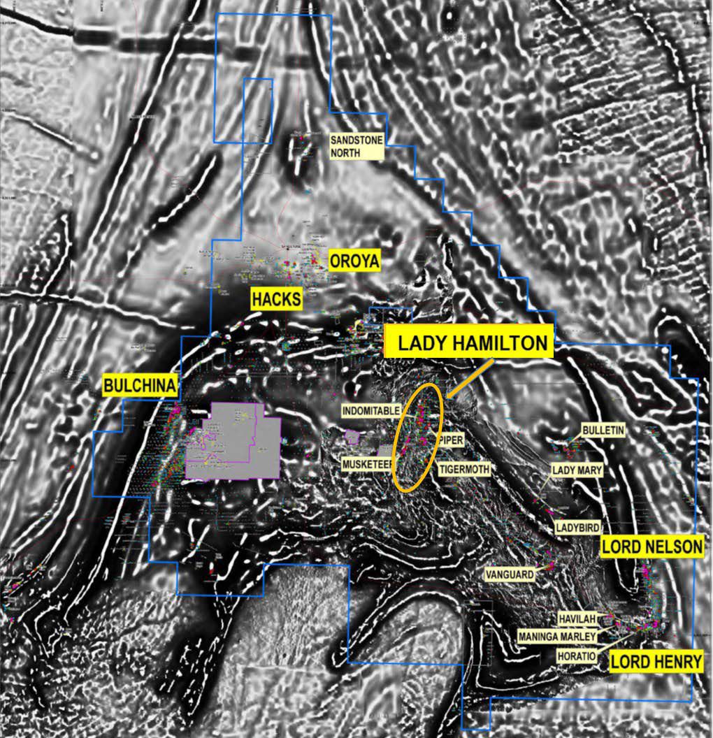 The Lady Hamilton prospect covers an area of 6km x 6km and encompasses the former Troy Resources' Indomitable, Tigermoth, Piper and Musketeer prospects, where shallow Troy RC drill holes intersected oxide gold mineralisation. Troy's RC drilling was of insufficient depth to identify primary mineralisation (i.e. in fresh rock) and the litho-structural controls on gold mineralisation.