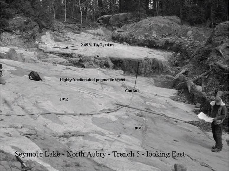 Historically, exploration at the North Aubry prospect was focused on the tantalum potential contained within the pegmatite structures, as seen in the 2006 Dimmell and Morgan report where a 4m channel returned an average grade of 2.49% tantalum pentoxide (Ta2O5).