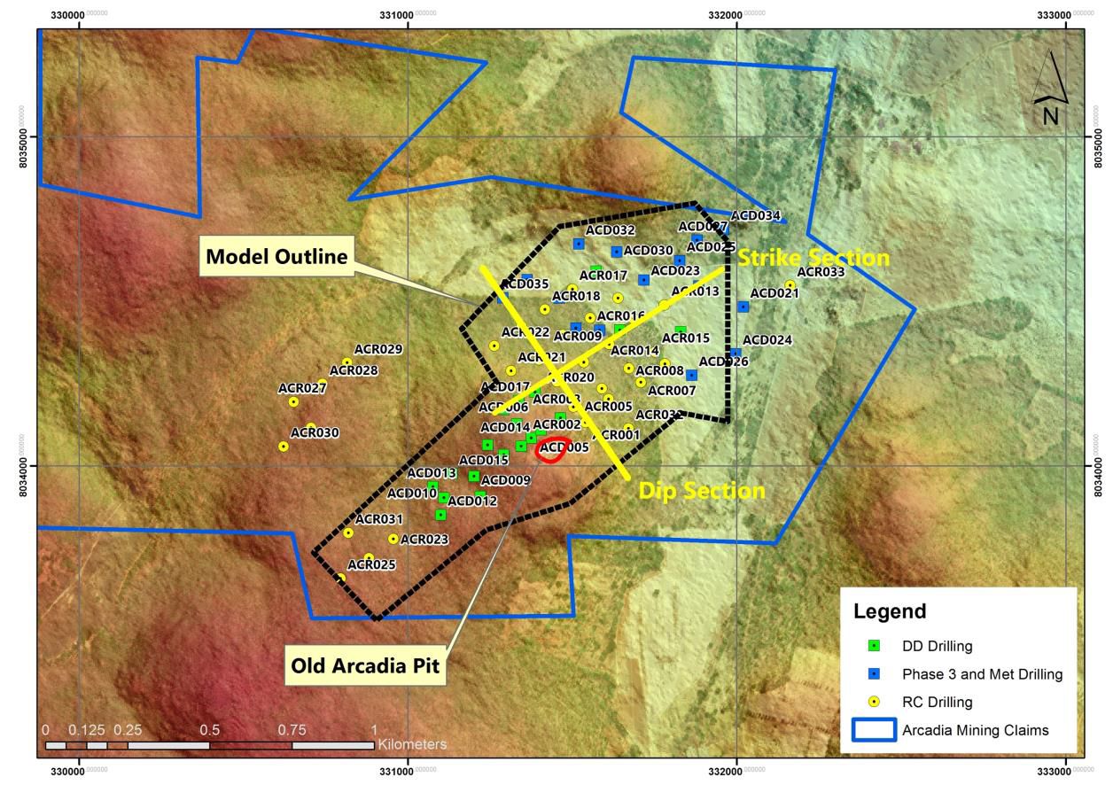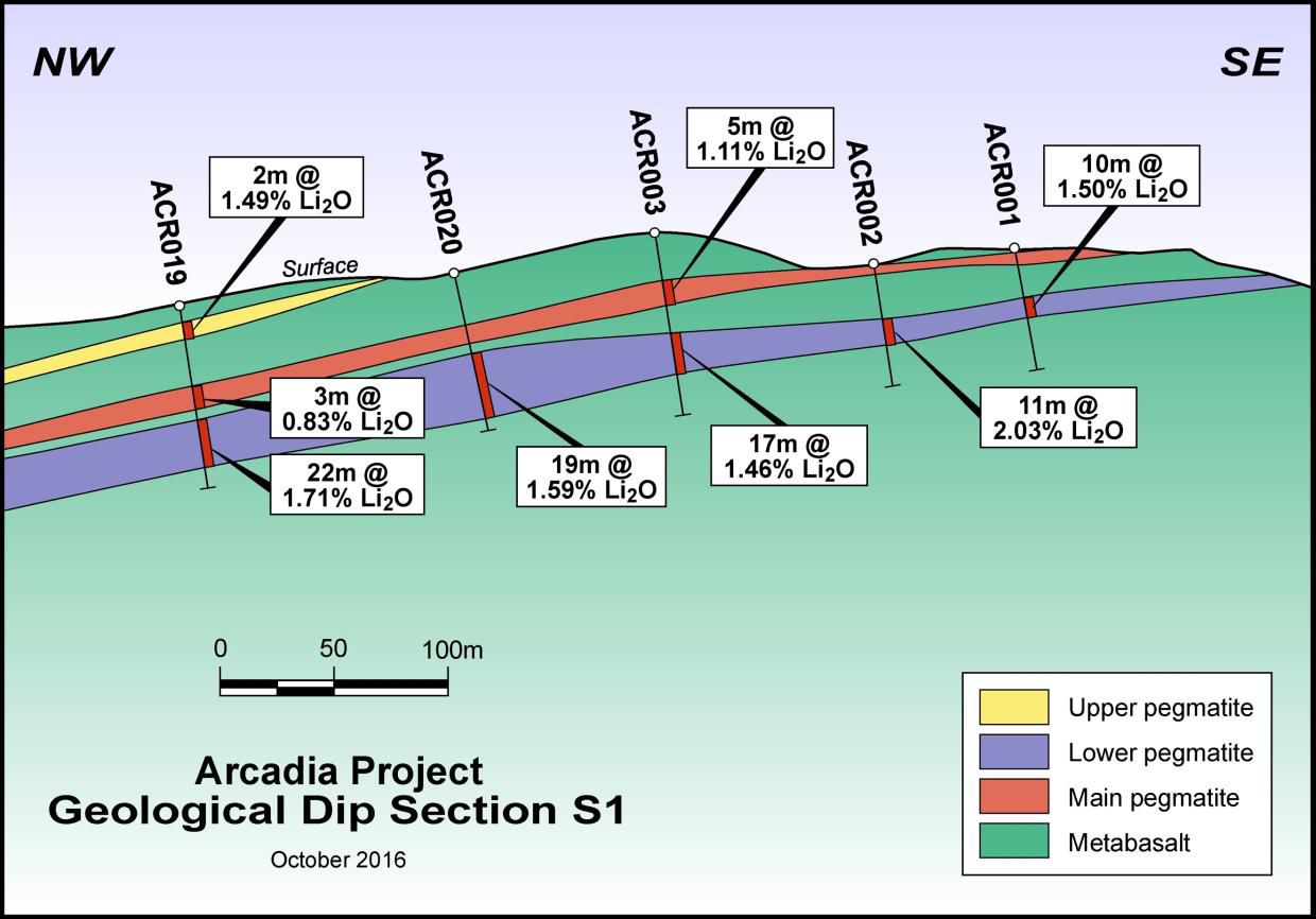 Drilling: The original Phase 1 resource drilling programme undertaken in July, comprised 16 diamond holes, totalling some 1,387m. The focus was testing the down-dip and strike extent of the pegmatite in the old Arcadia pit. This had been exploited for lithium and beryl intermittently during the 1960s and '70s.