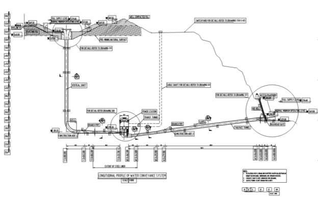 - The upper and lower storage reservoirs will be connected by an underground water conveyance shaft, short pressure tunnel and a tailrace tunnel; and