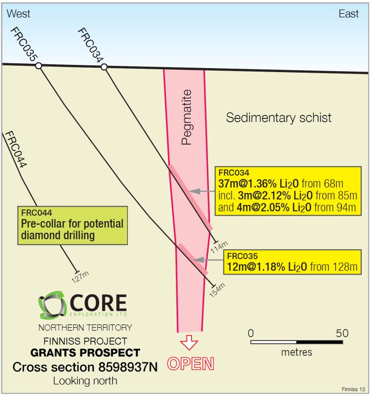 ASX:CXO) ("Core" or the "Company") is pleased to announce that high grade lithium assays have been received in the first batch of results from the Phase 2 RC drilling at the Grants Prospect, which have increased the size and depth of continuous high grade mineralisation defined at Grants Prospects within the Finniss Lithium Project near Darwin in the NT ("Finniss").