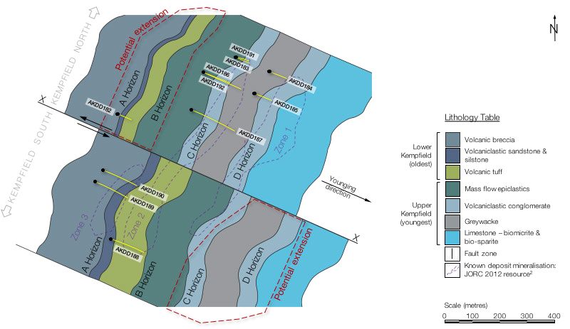 The three drill holes in the south of the Kempfield Project area (AKDD197, AKDD198 and AKDD199) have been positioned to intersect key geophysical anomalies that had not been previously drill-tested. Drill hole AKDD197 was designed to intersect a strong IP anomaly overlapping a strong magnetic anomaly that AKDD198 and AKDD199 were designed to test. The coincident magnetic and IP anomalies imply the potential presence of concentrated sulphides. These two positions will also provide valuable stratigraphic information on the genetic history of the Kempfield deposit.