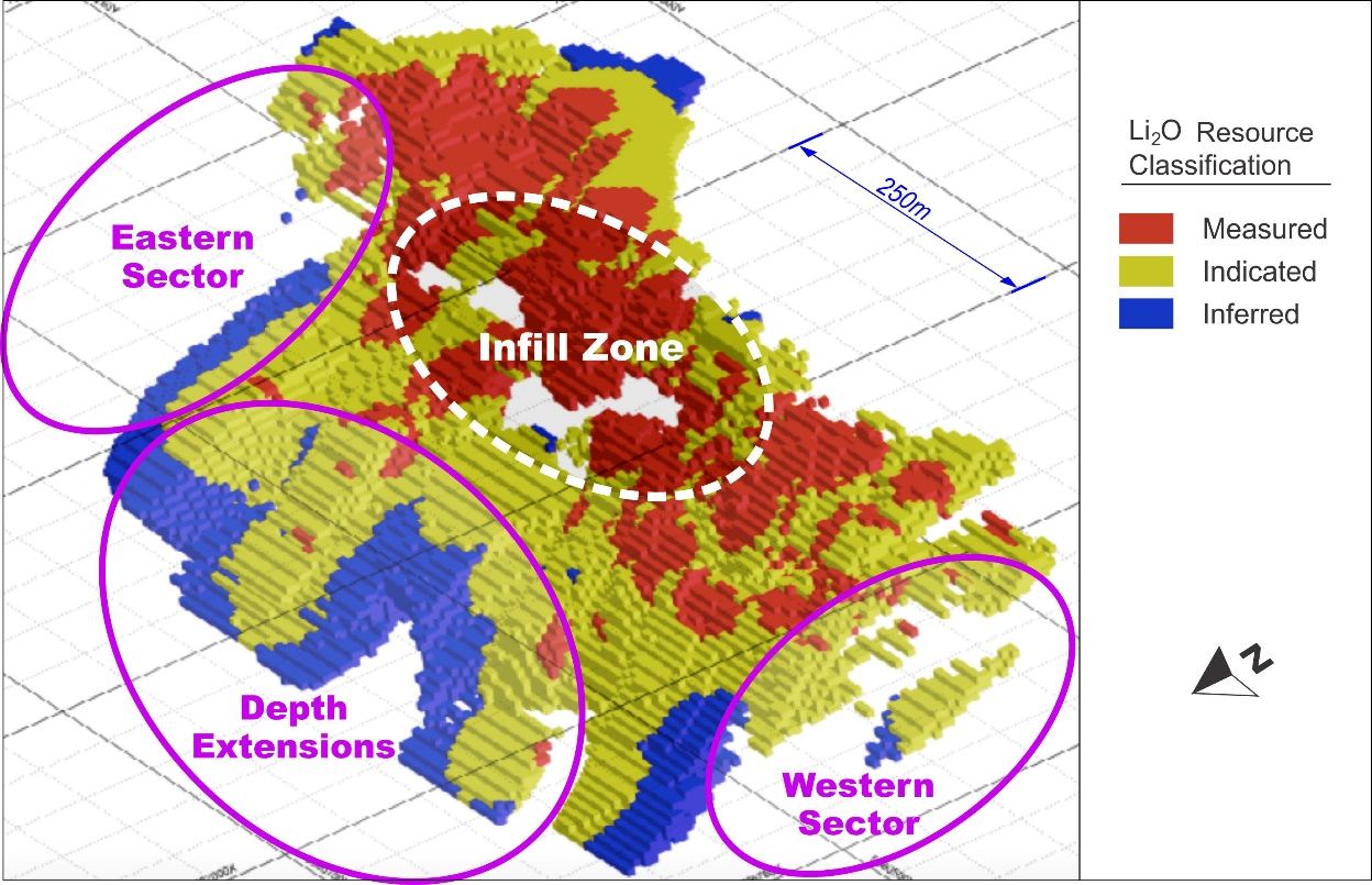 - Defining the mineralised boundaries and lifting the resource categories in zones in the western sector that were drilled during the 2016 drill program. The most western hole drilled in the 2016 program intersected 46m @ 1.26% Li20 including 24m @ 1.62% Li20;