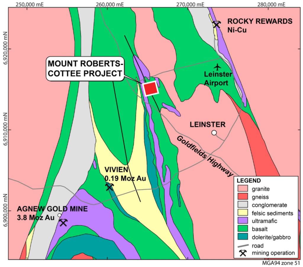 The project area is characterised by a tightly folded sequence of altered komatiites, basalts, felsic volcanics, and fine sediments. Mt Roberts is located on the eastern limb of the Mt White Syncline and the western limb of the Leinster Anticline. Major NNW-striking shears are located to the east and west with secondary mineralised splays occurring within the licence area. Gold mineralisation at Mt Roberts occurs within shear zones near the ultramafic-mafic contact. It forms a steeply west-dipping lens approximately 200m along strike based on drilling intercepts, and remains open at depth.