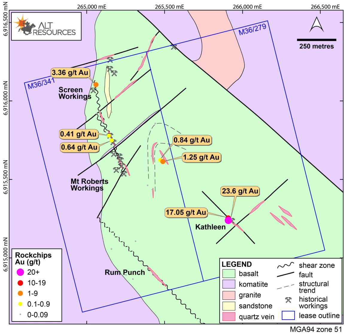 A new zone of parallel, sheeted, mineralised quartz veins has been defined in the nose of the regional Leinster Anticline, and appears to lie along strike from known mineralisation at the historical Kathleen Workings. Samples collected from the fold nose quartz veins returned up to 1.25 g/t Au (see Figure 2 in the link below). Quartz veins in this location are narrow, sheeted and are associated with extensive wall-rock alteration of the host gabbros and basalts. Additional rock chip samples were collected from Screen and Kathleen. The Kathleen rock chip samples returned up to 17.05 and 23.6 g/t Au, whilst the Screen workings samples returned up to 3.36 g/t Au.