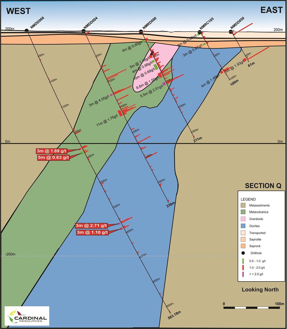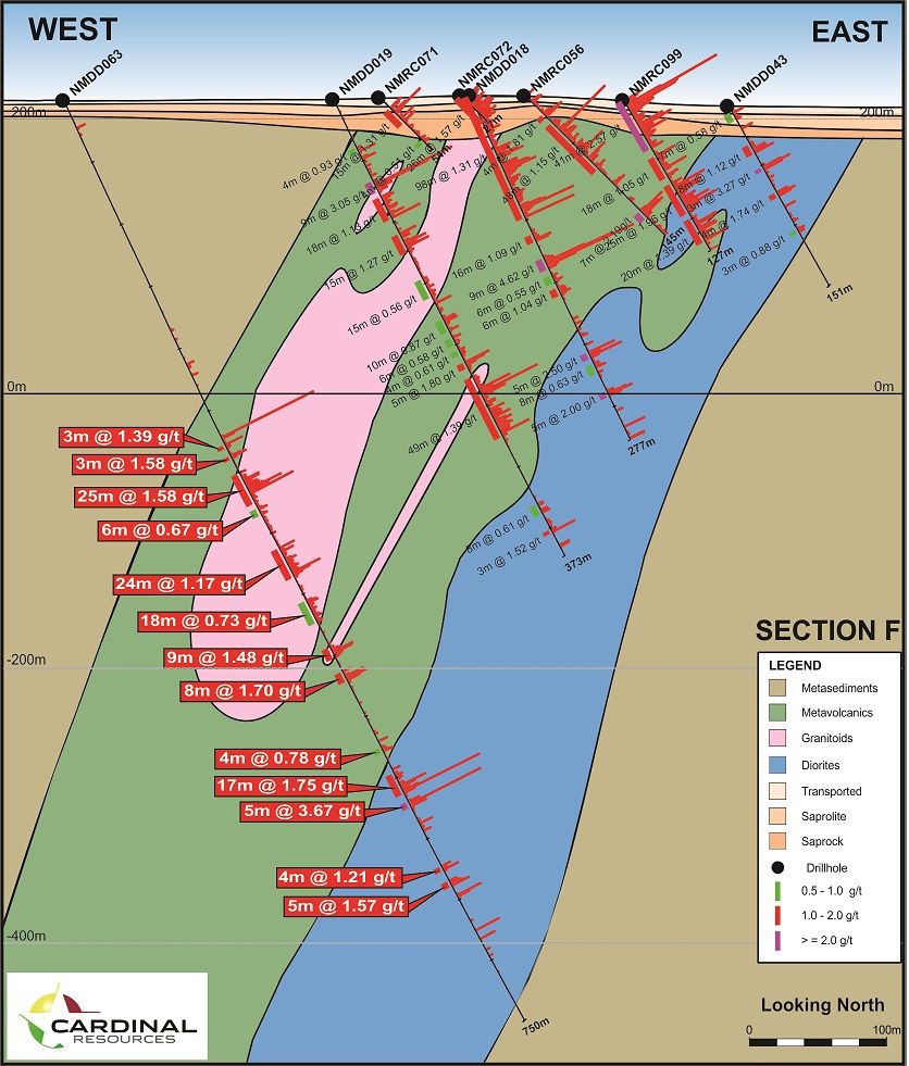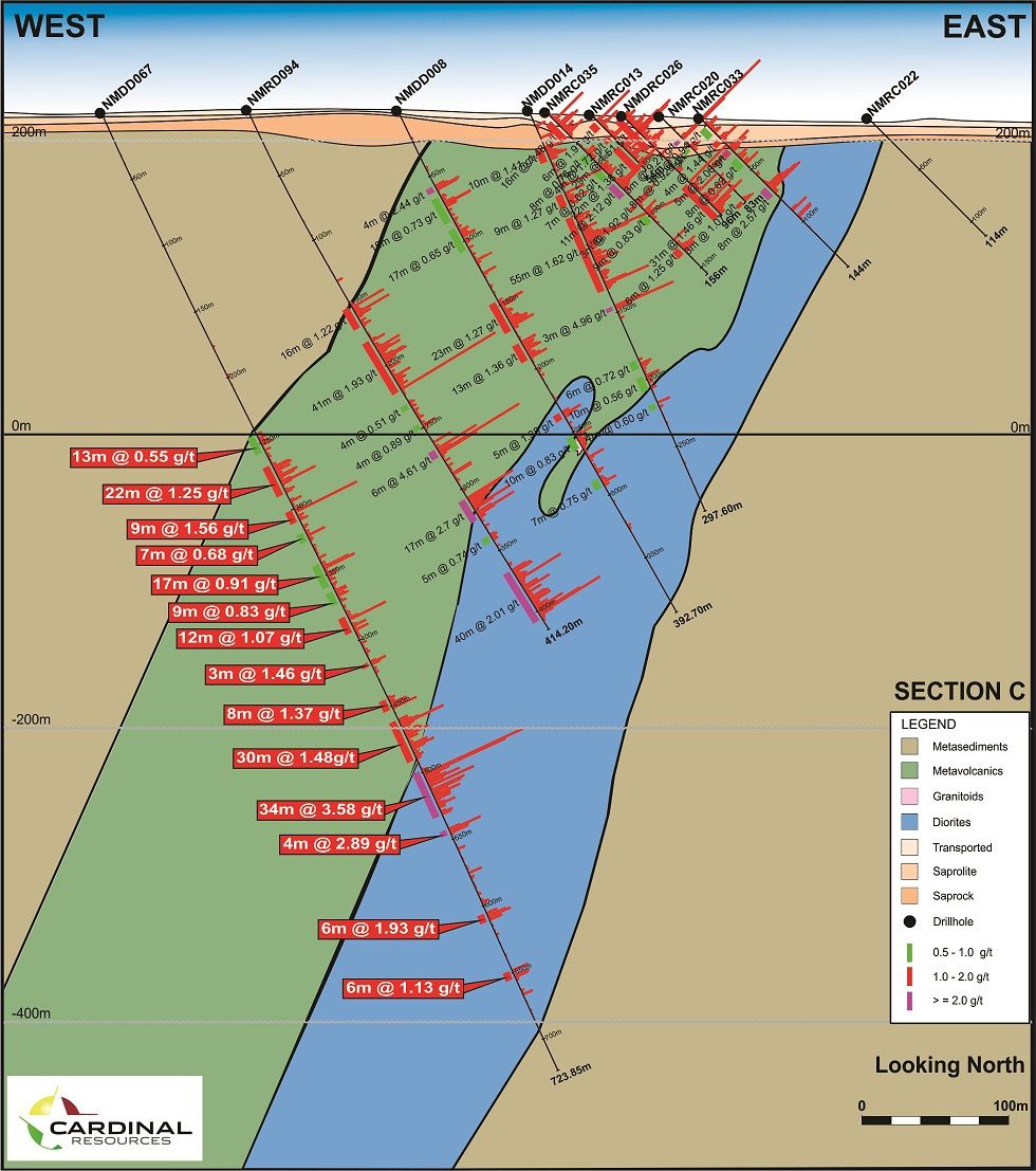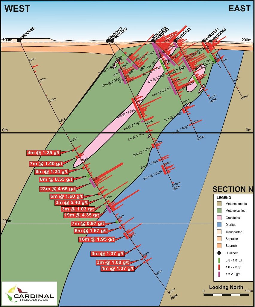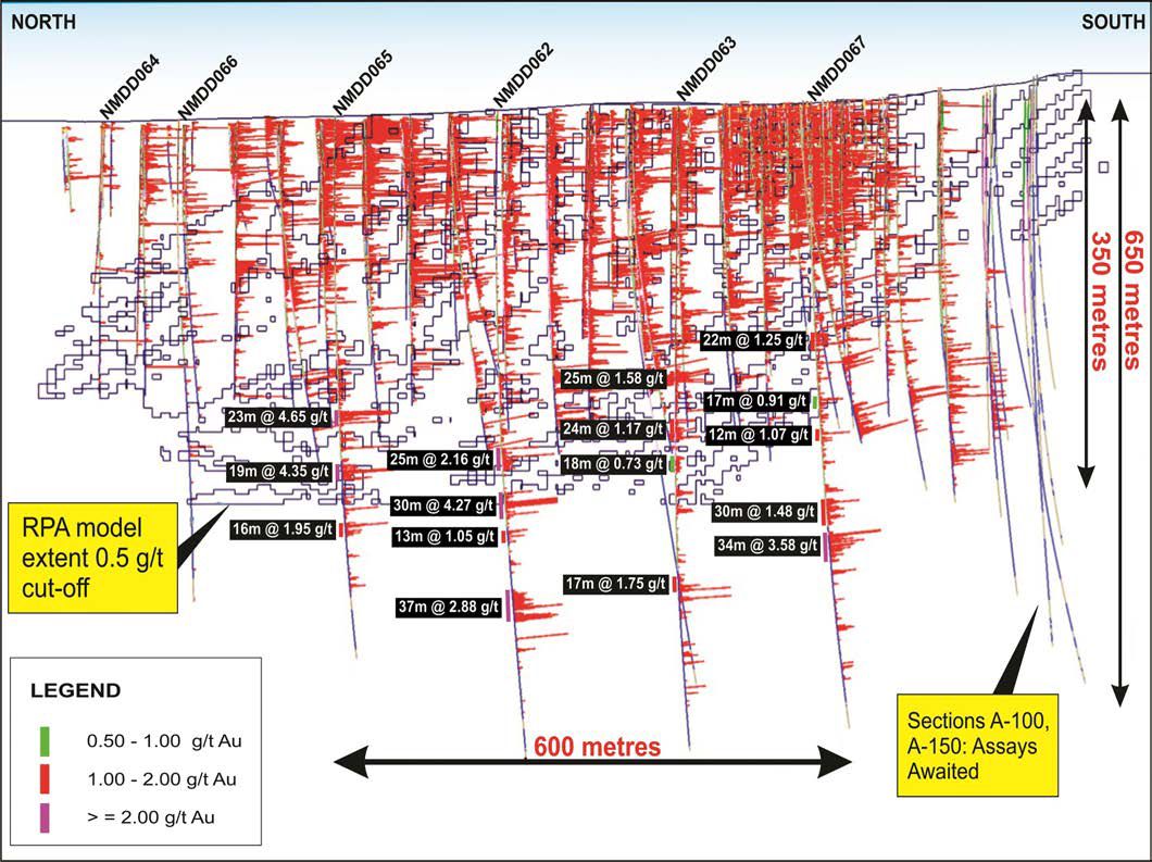 Table 1 (see the link below) lists the drill hole intersections in previously released drill hole NMDD062 through to NMDD067, based on a reporting rule of a minimum 3 metres down hole mineralised length, a maximum of 3 metres consecutive 'sub-grade' and a lower cutoff grade of 0.5 g/t.